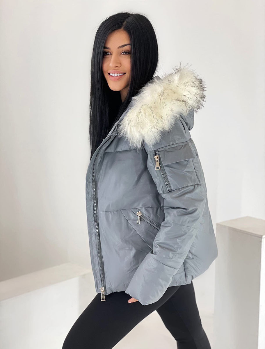 Описание: Куртка женская зимняя серого цвета. Застежка на молнии. Есть два кармана на молнии и один на рукаве. Капюшон декорирован искусственным мехом.