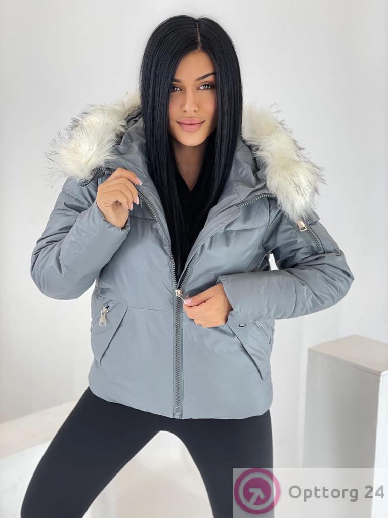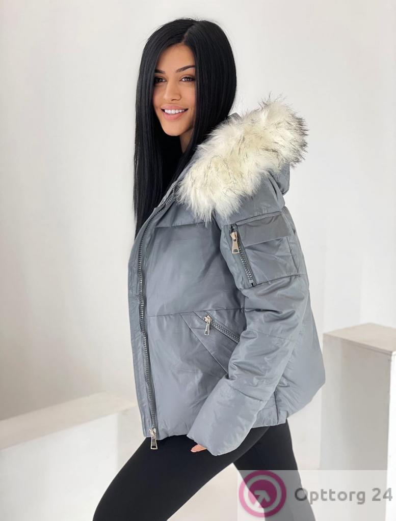 Куртка зимняя женская с искусственным мехом цвет серый оптом