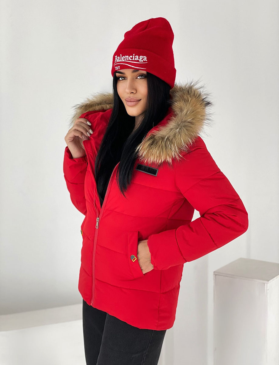 Описание: Куртка зимняя женская цвет ярко-красный. Высокий воротник. Есть капюшон декорирован натуральным мехом. Застежка на молнии, есть два кармана.