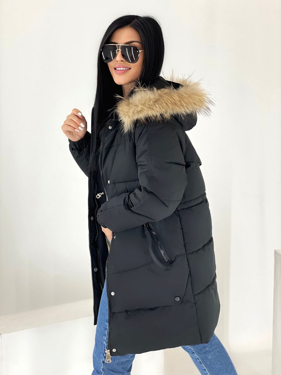 Описание: Куртка зимняя женская черного цвета, удлиненная. Манжеты рукавов на резинке. Высокий воротник. Капюшон декорирован натуральным мехом. Застежка на молнии с ветрозащитной планкой на кнопках, есть карманы.