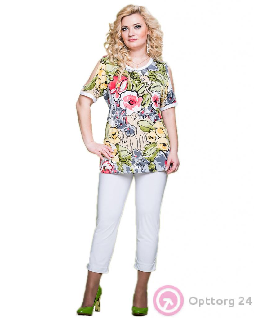 Летняя женская блуза в стиле туники с изысканными разрезами в плечевой части рукава. Край горловины и рукав обработаны белой бейкой. Блуза будет отлично сочетается с узкими брюками или легинсами белого цвета.