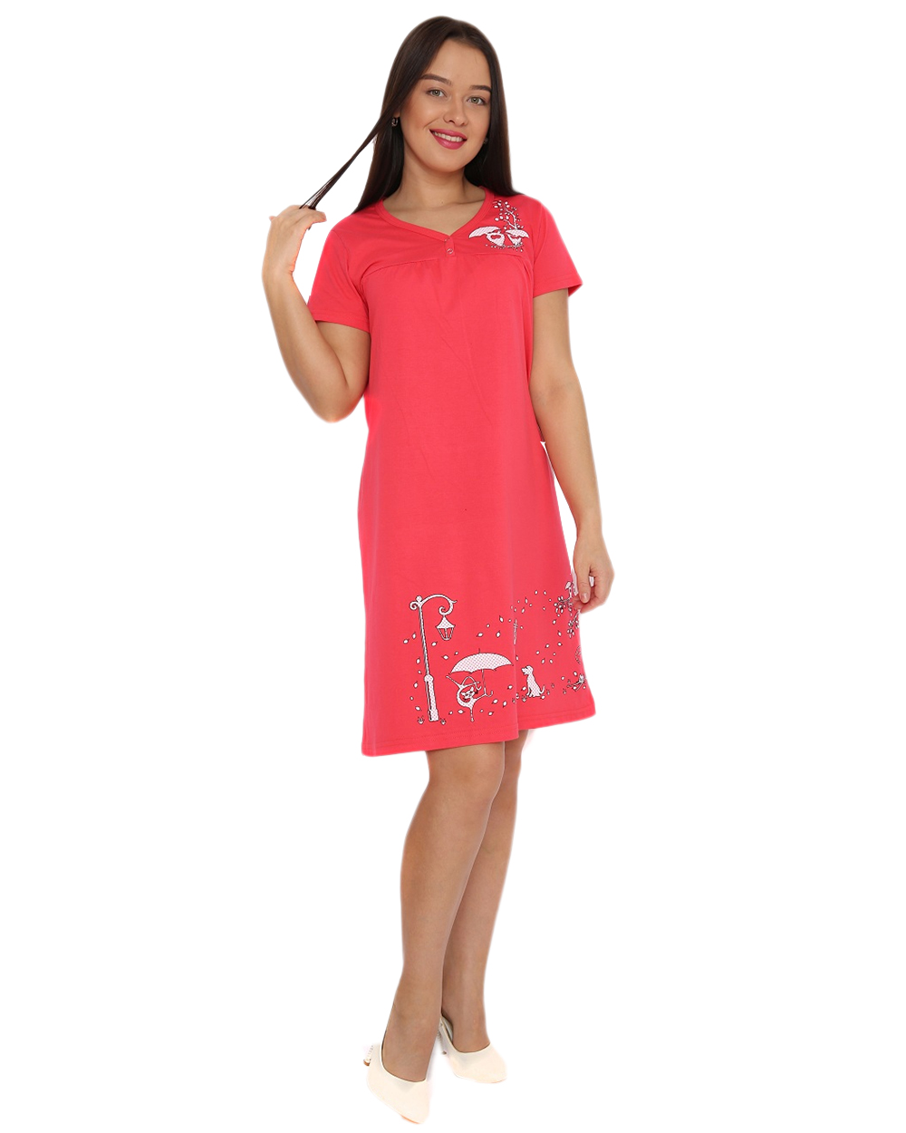 Легкая хлопчатая ночная рубашка. Изделие выполнено в красном цвете и имеет неольшие рисунки внизу и на плече спереди.