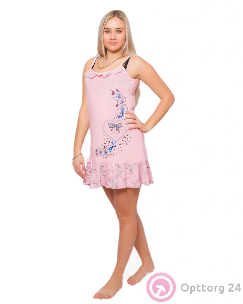 Женская ночная рубашка розового цвета и плиссировкой снизу. Модель на бретельках. Рубашка дополнена рисунком сердечек.