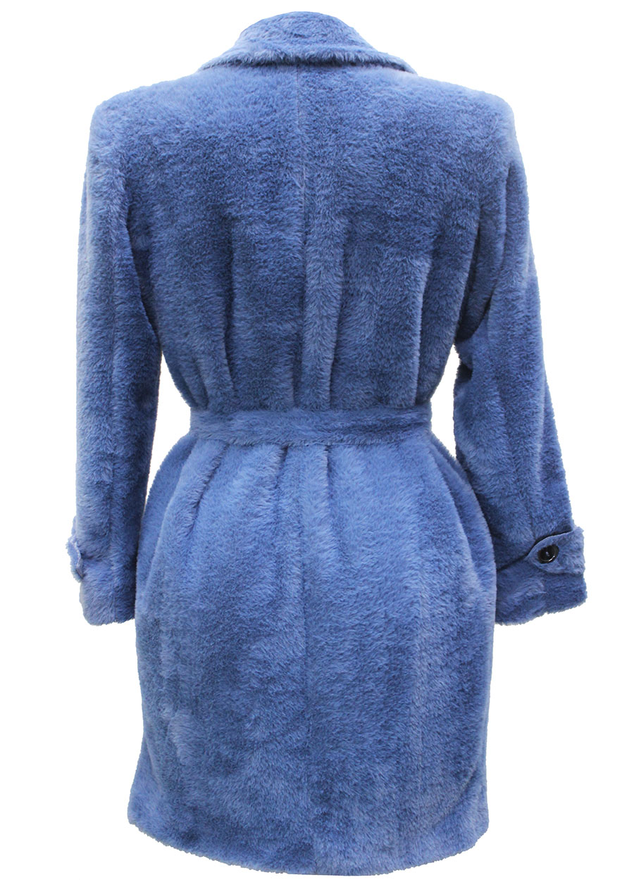Пальто облегченное удлиненное голубое с поясом меховое. Есть внутренние карманы и пояс.