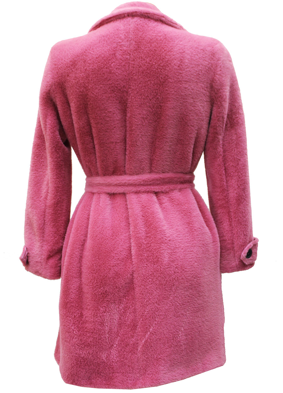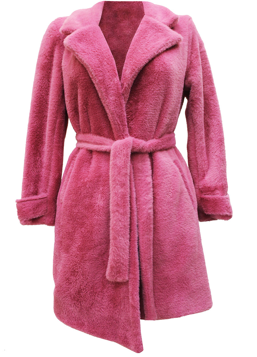 Пальто облегченное удлиненное ярко-розовое с поясом меховое. Есть внутренние карманы и пояс.