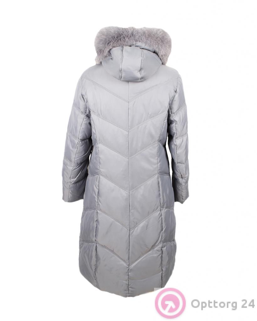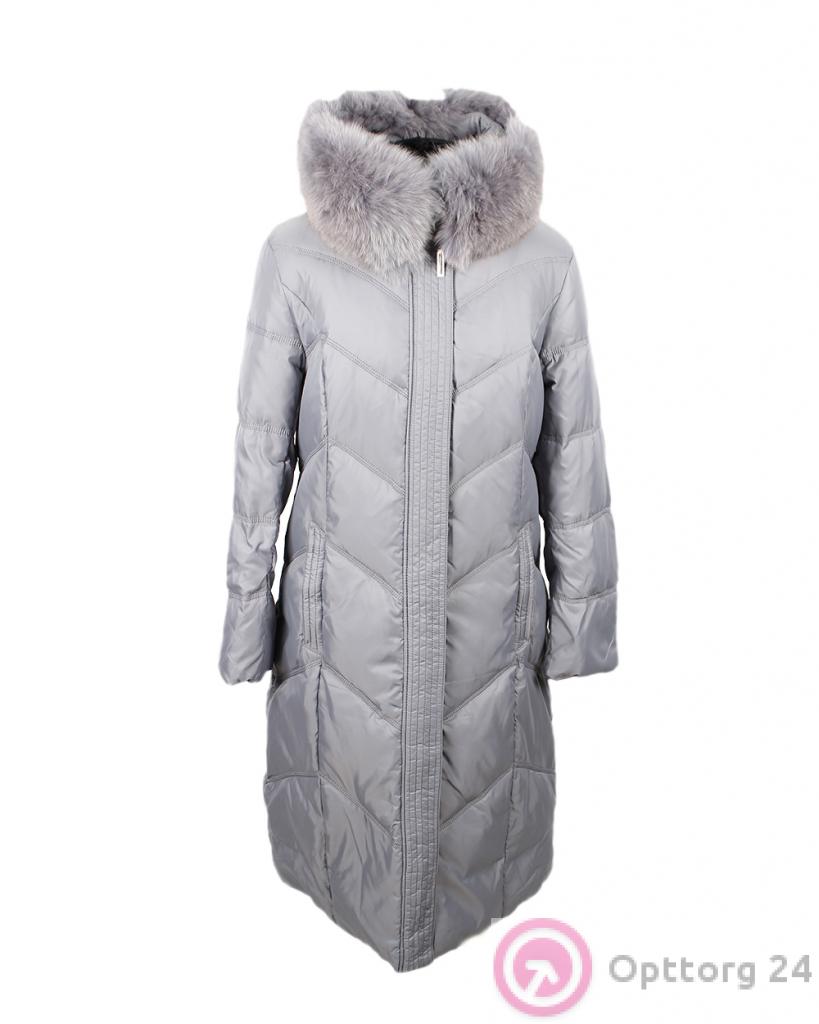 Теплый женский пуховик серого цвета на молнии. Моедль имеет капюшон с натуральным мехом.