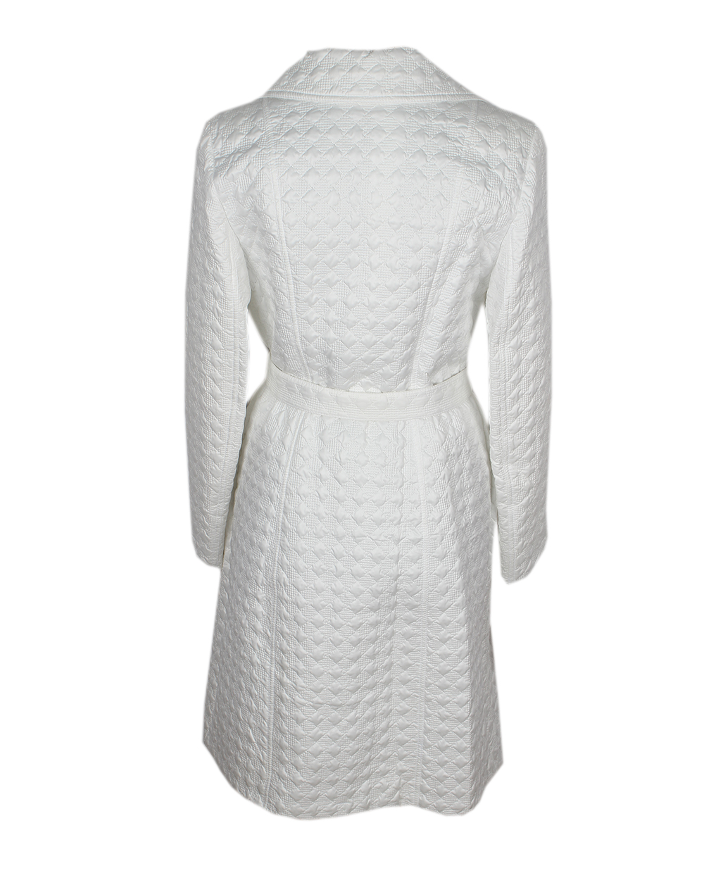 Женское пальто белого цвета. Изделие имеет пояс в комплекте. V-образная горловина.