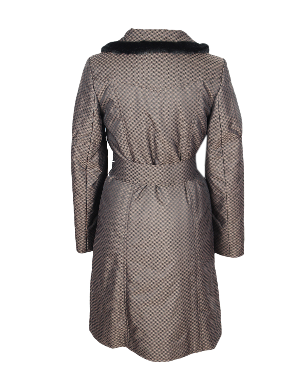 Женское пальто коричневого цвета с принтов в клетку. Модель дополнена поясом. Отложной воротник с рнебольшой полоской меха.