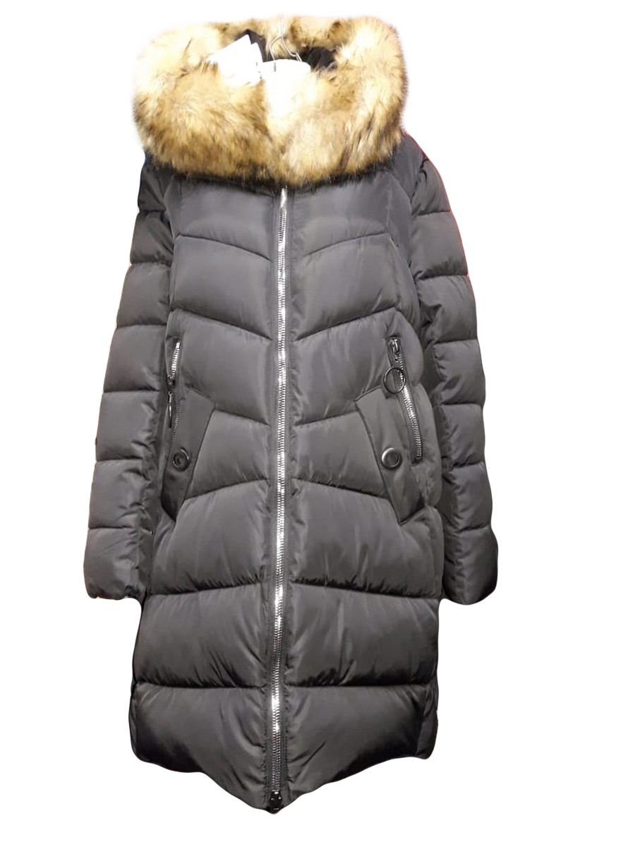 Черное пальто для женщин черного цвета стеганое длиной ниже колена. Приталенный силуэт. Есть карманы, декорированные пуговицами, и капюшон с мехом.