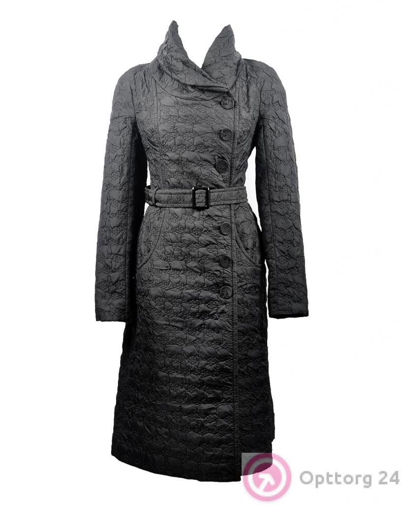 Приталенное женское пальто с поясом отлично подчеркнет все достоинства фигуры. Оригинальный воротник-стойка и узор на ткани выгодно разбавляют классический образ.