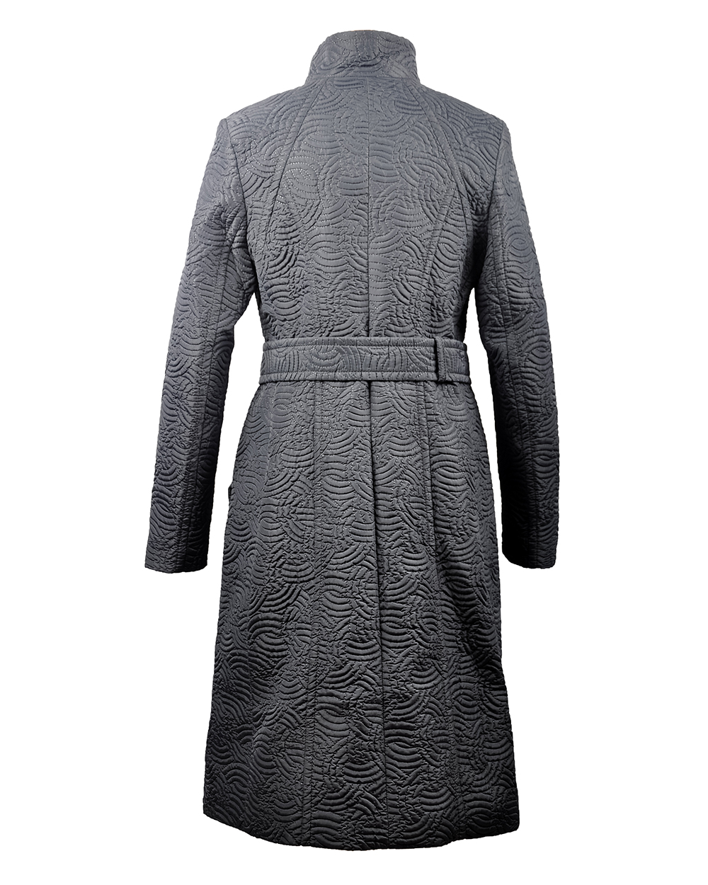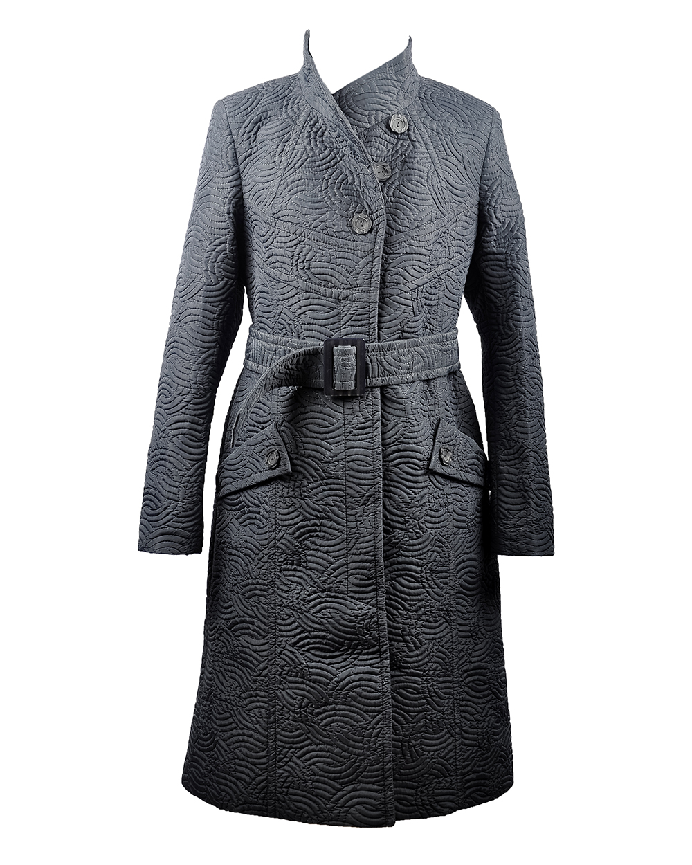 Классическое серое пальто с косой застежкой, которая добавляет ему нотку оригинальности. Так же стоит выделить искусно-сделанную фигурную строчку по ткани.
