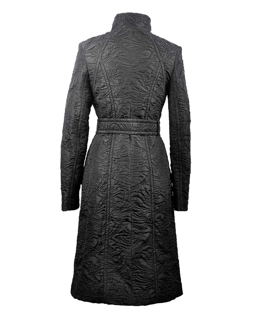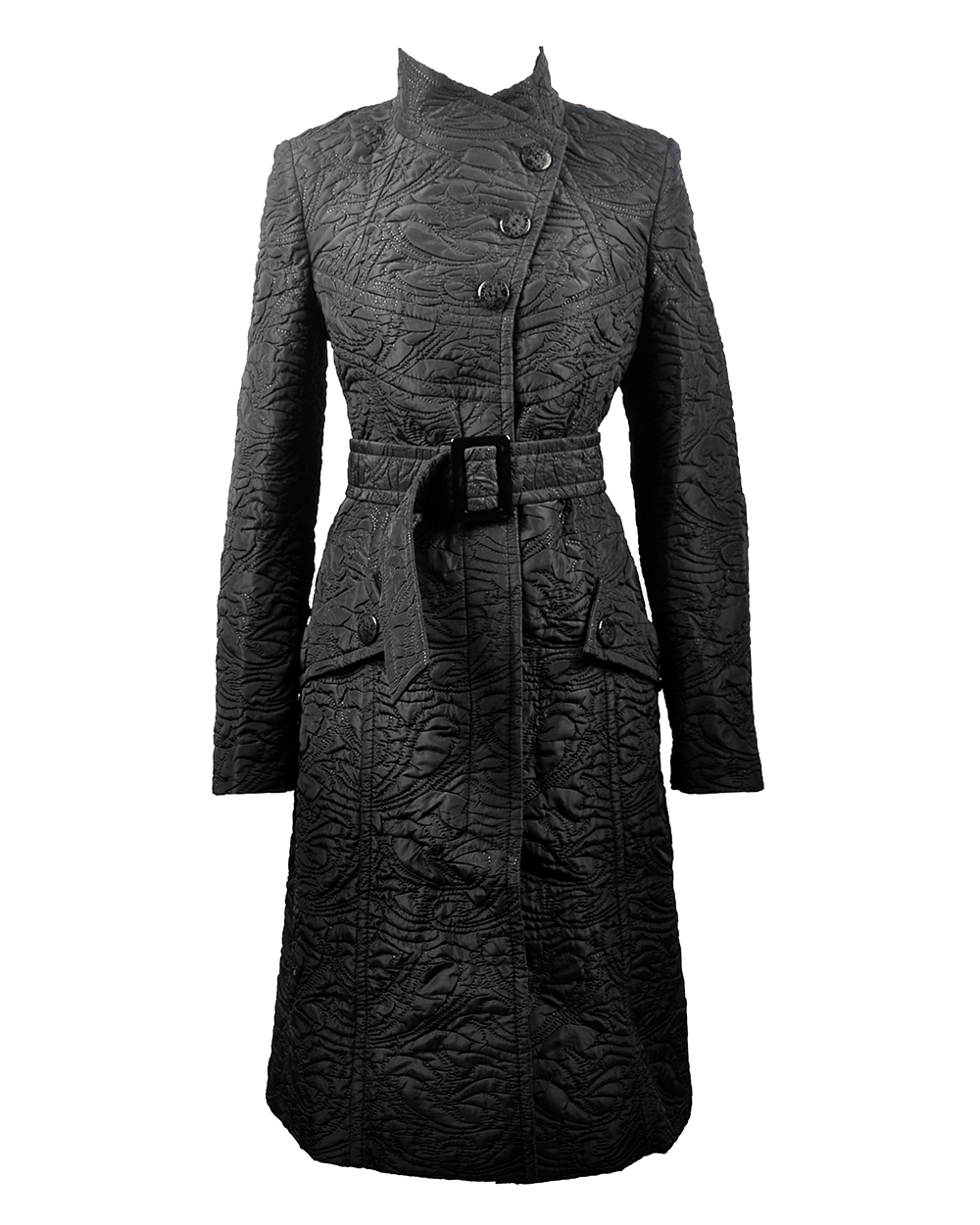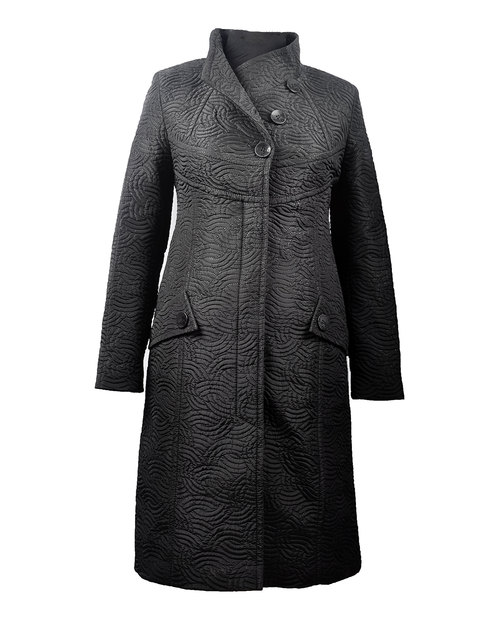 Черное, слегка приталенное пальто. Изюминкой этой модели является застежка наискосок и фактурное покрытие ткани. Хороший вариант на весеннюю пору.