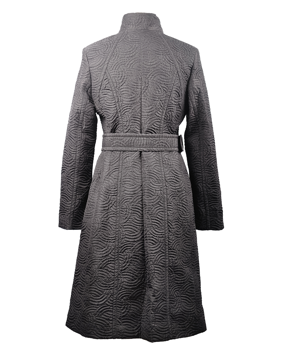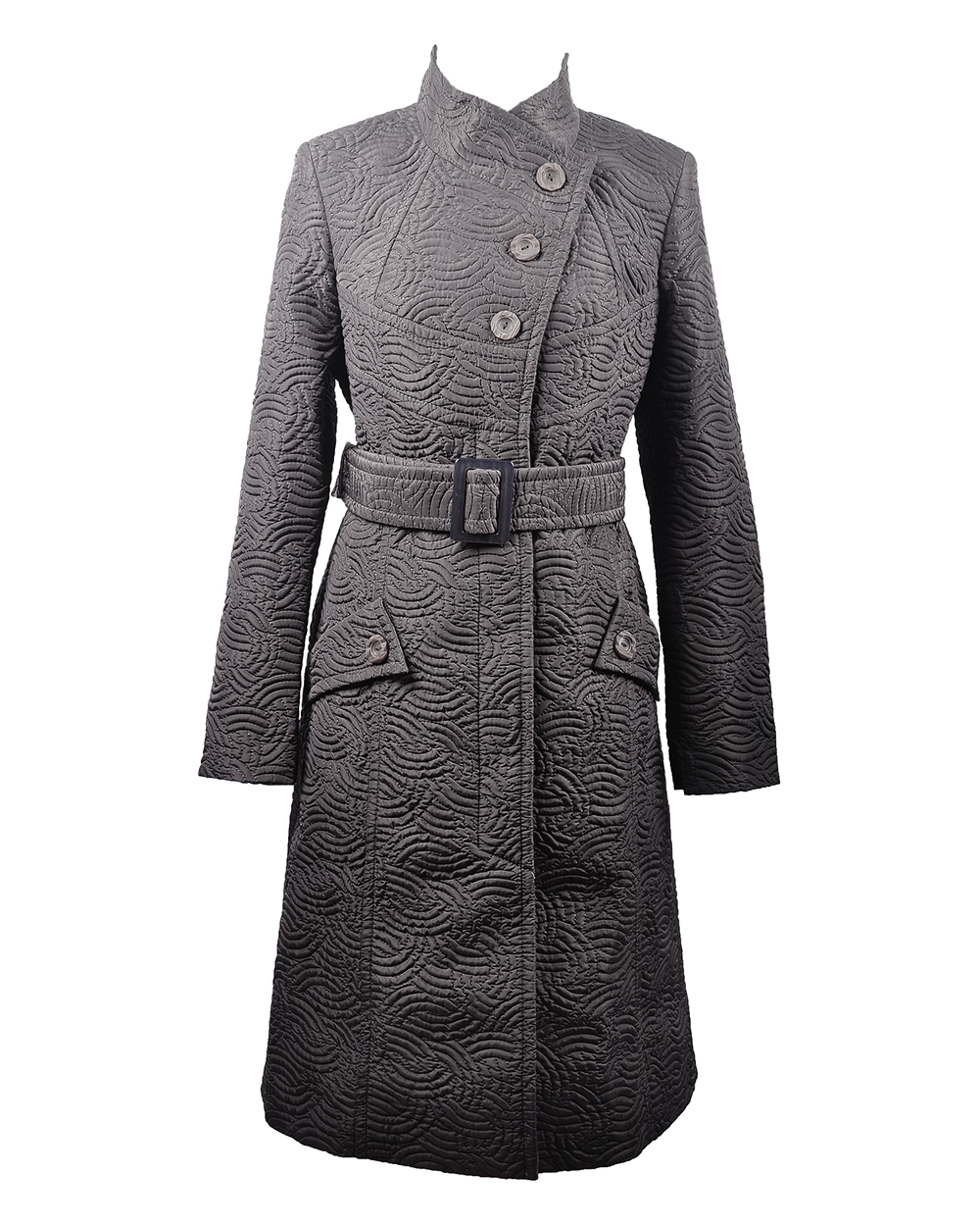 Это длинное приталенное пальто станет отличным дополнением в гардеробе любой модницы. Благодаря его оригинальному крою, оно прекрасно сидит по фигуре, а набивной узор на ткани добавляет ему французского шарма.