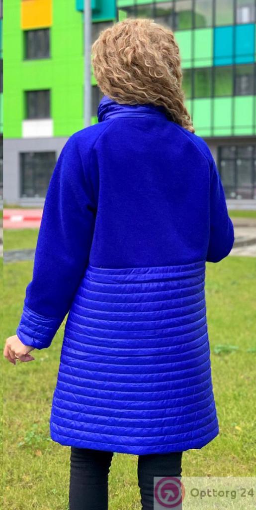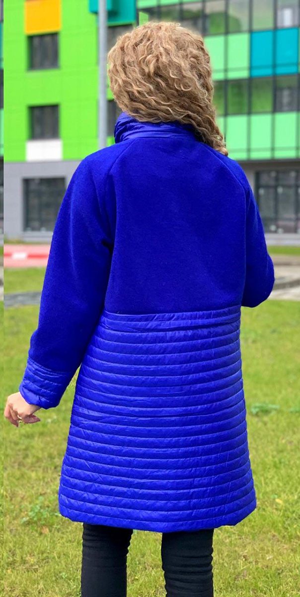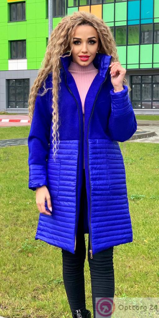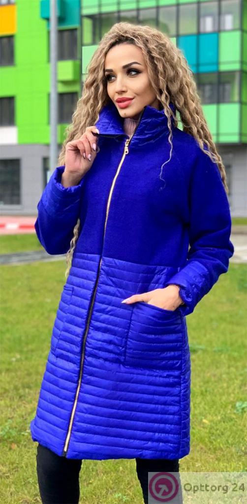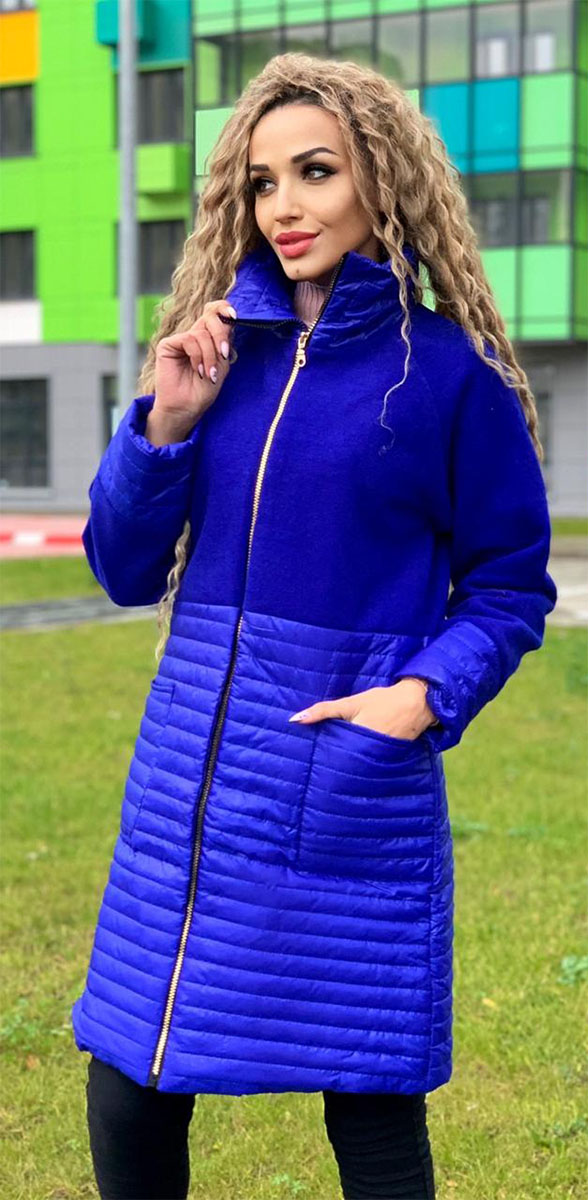 Описание: Пальто женское комбинированное на синтепоне, насыщенного синего цвета. Застежка на молнии. Воротник стоечка. Два накладных кармана.
