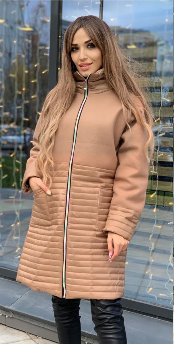 Описание: Пальто женское комбинированное на синтепоне, бежевого цвета. Застежка на молнии. Воротник стоечка. Два накладных кармана.