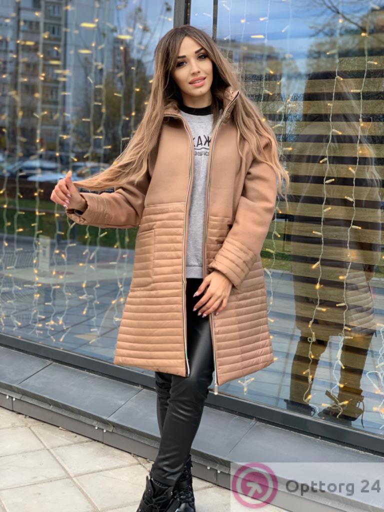 Пальто женское комбинированное на синтепоне бежевого цвета оптом