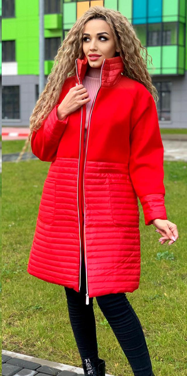 Описание: Пальто женское комбинированное на синтепоне, насыщенного красного цвета. Застежка на молнии. Воротник стоечка. Два накладных кармана.