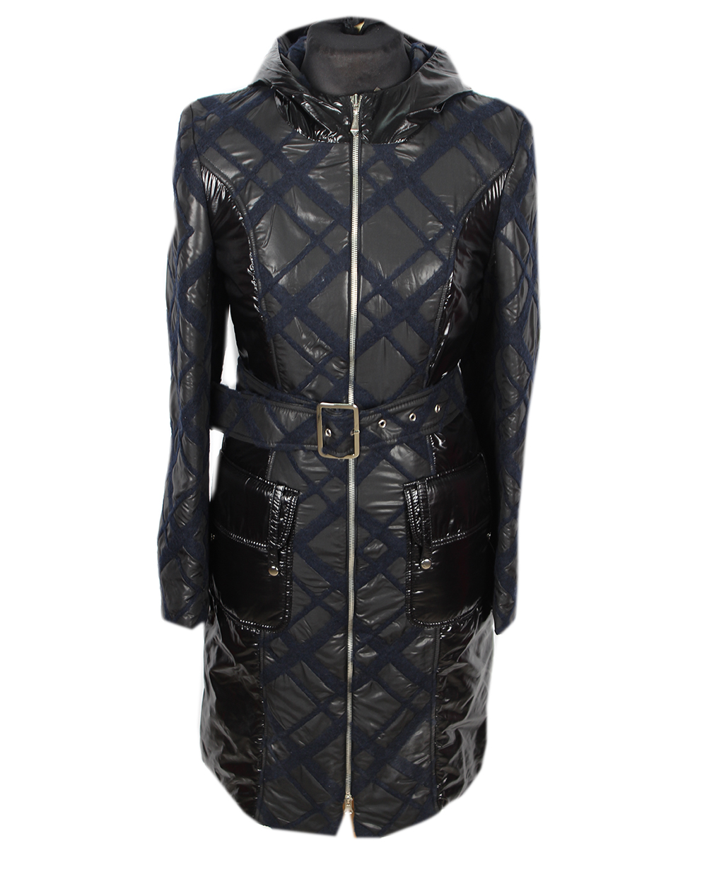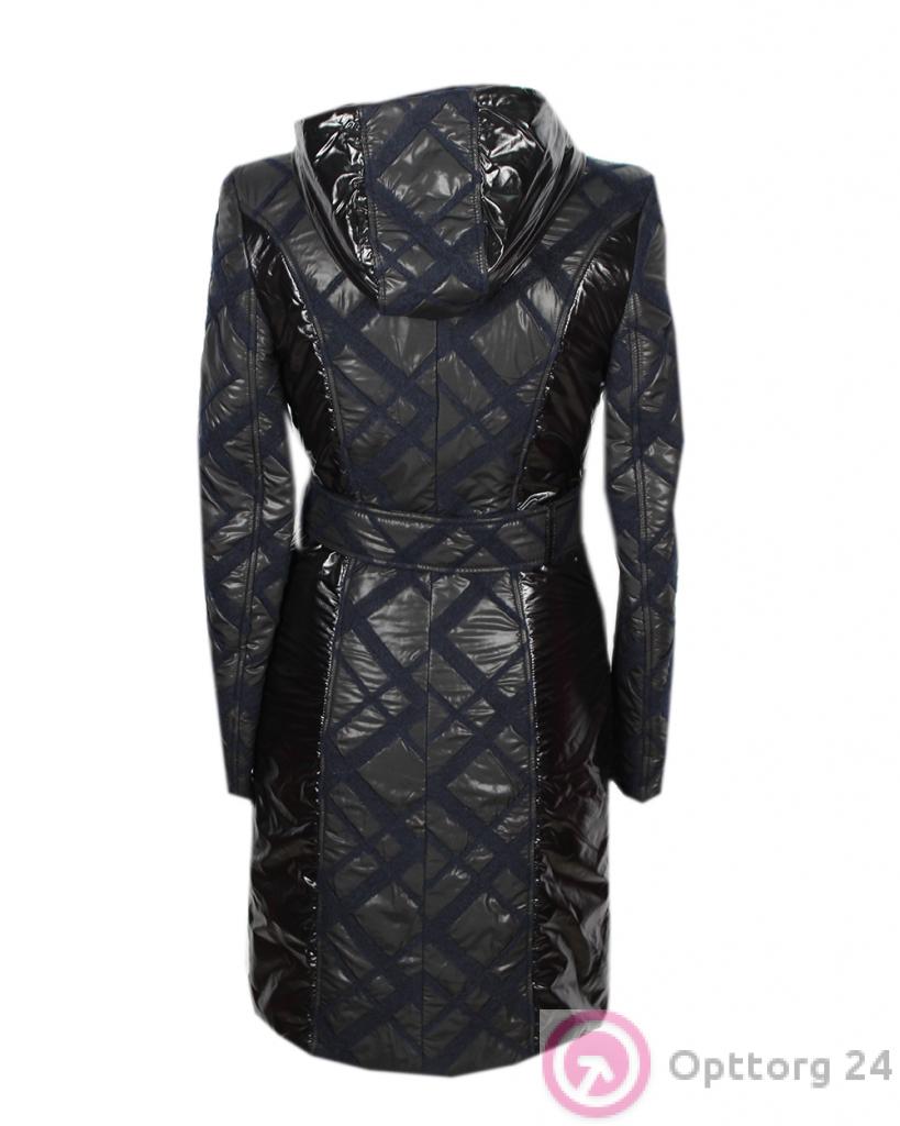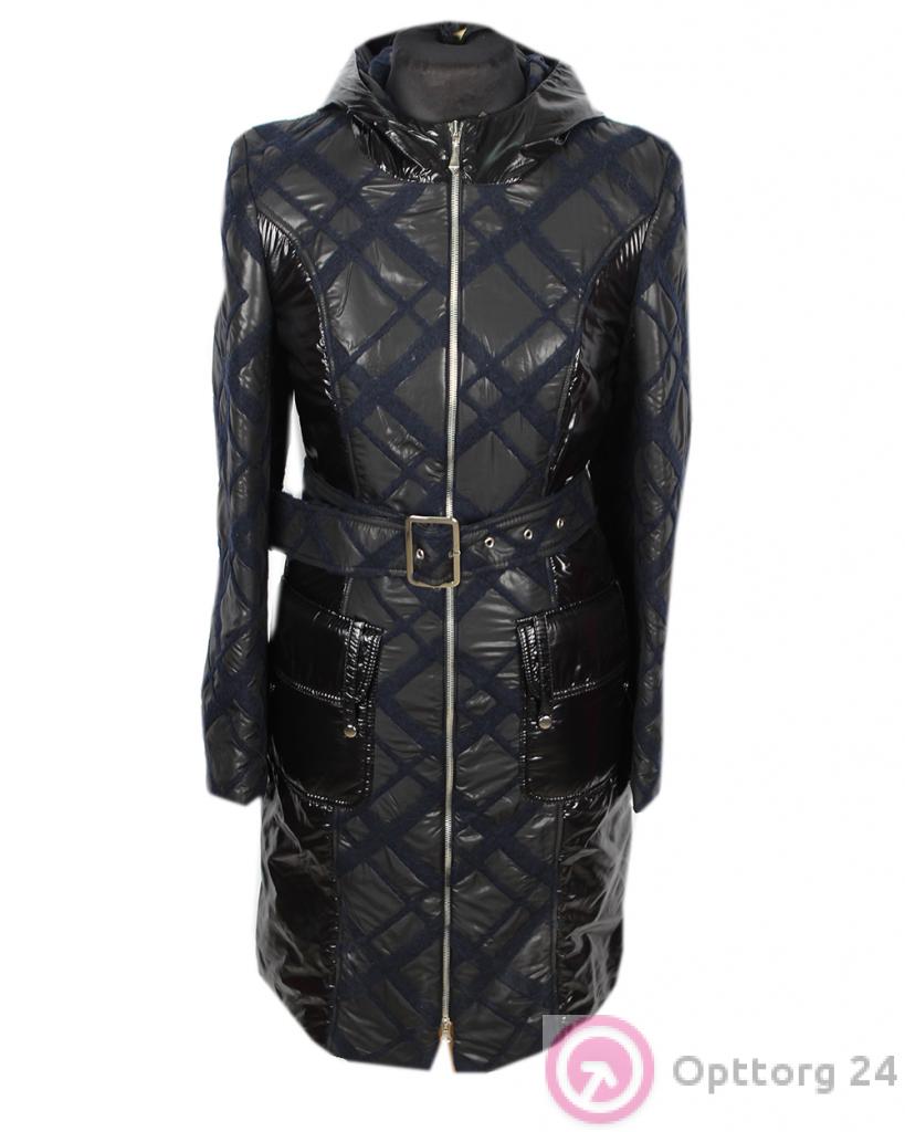 Модное женское пальто из комбинированных материалов. Изделие дополнено поясом. Застежка - молния.