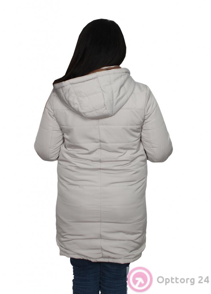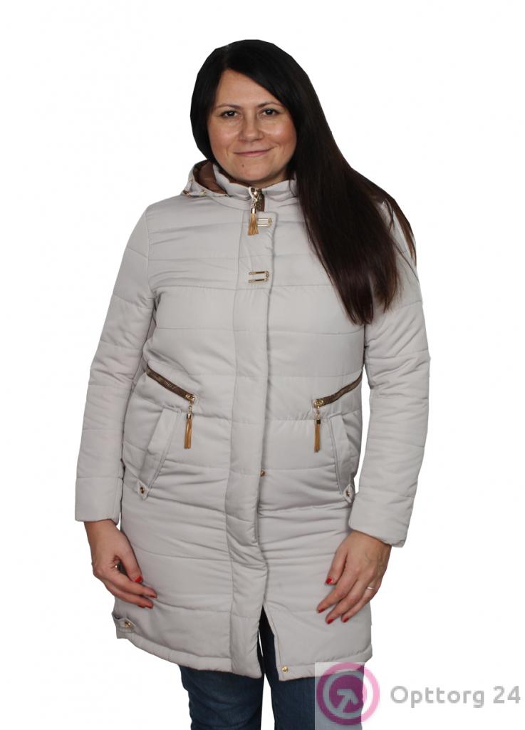 Пальто женское на синтепоне стильного белого цвета. Особый шарм изделию придают пуговицы и молнии золотого цвета, золотоые вставки на капюшоне, а так же коричневая подкладка