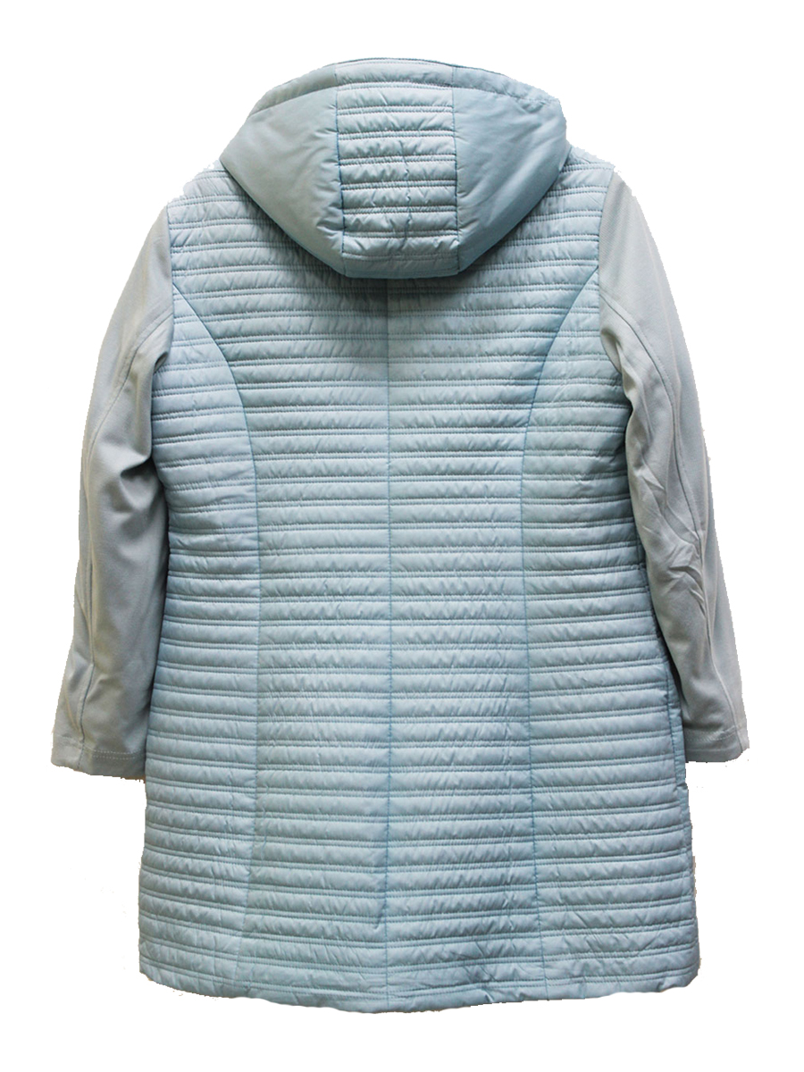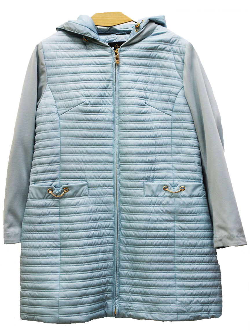 описание: пальто женское на синтепоне небесно-голубого цвета. На карманах есть брелки.