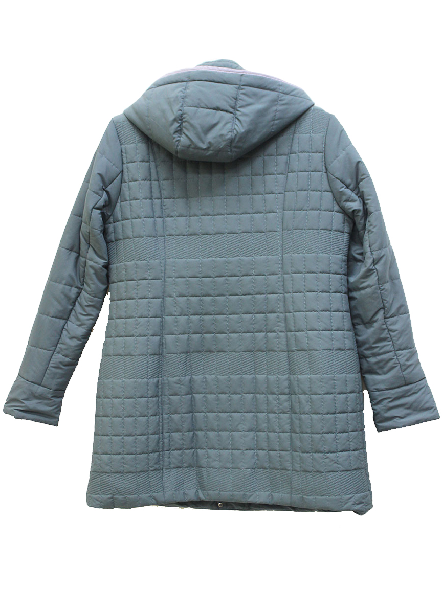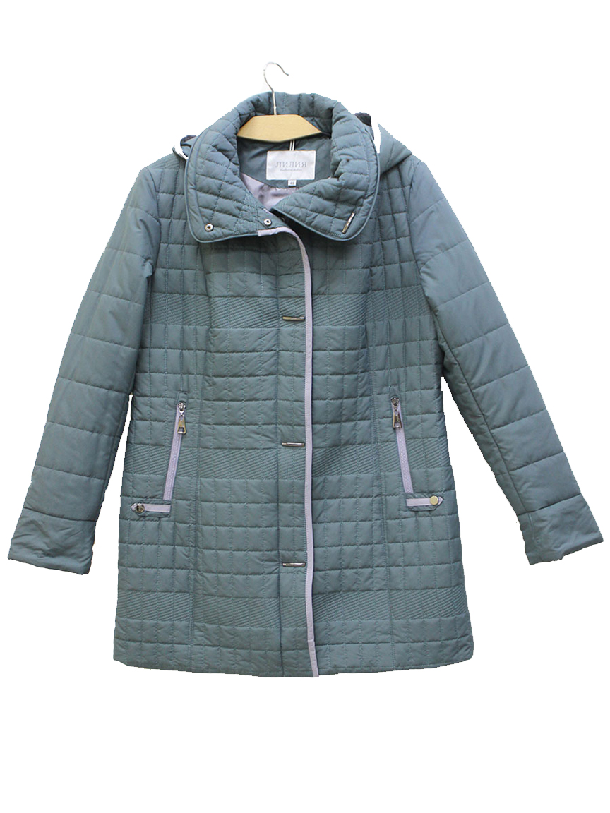 описание: пальто женское на синтепоне зеленое с лавандовыми вставками. Есть капюшон и карманы.