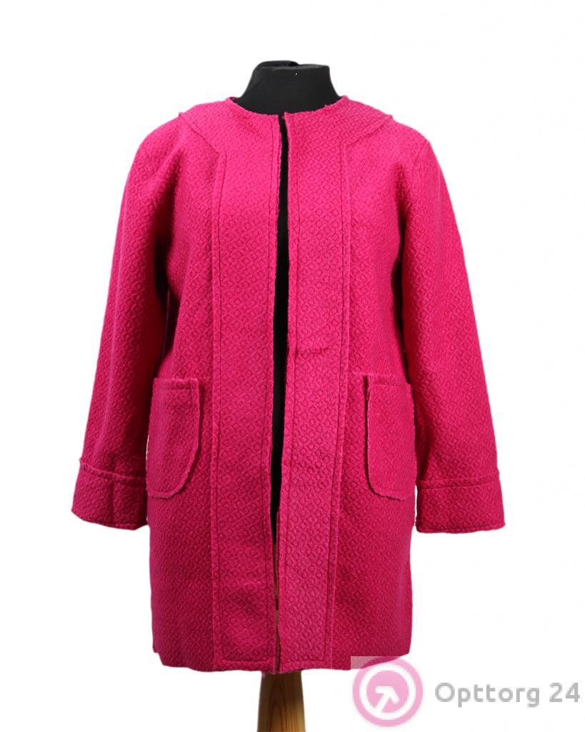 Женское розовое пальто из плотного текстиля с драпировкой. ККруглый вырез на горловине, два накладных кармана.