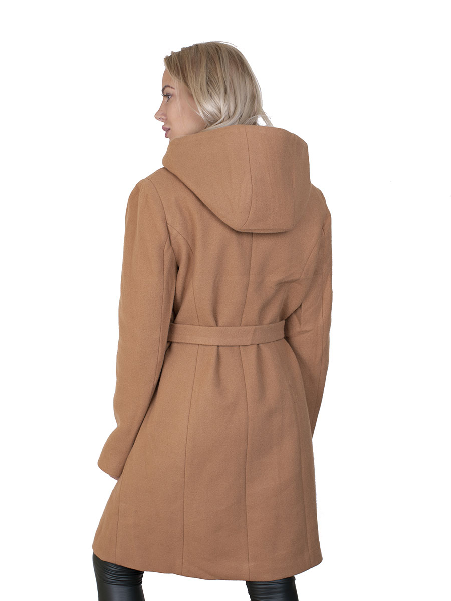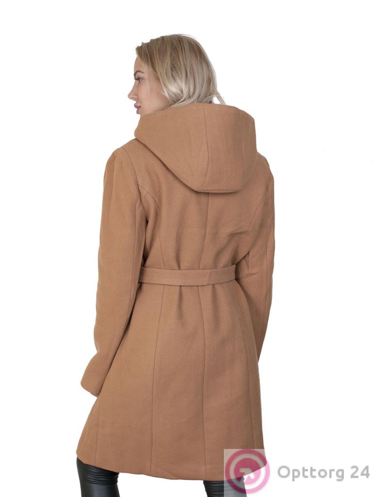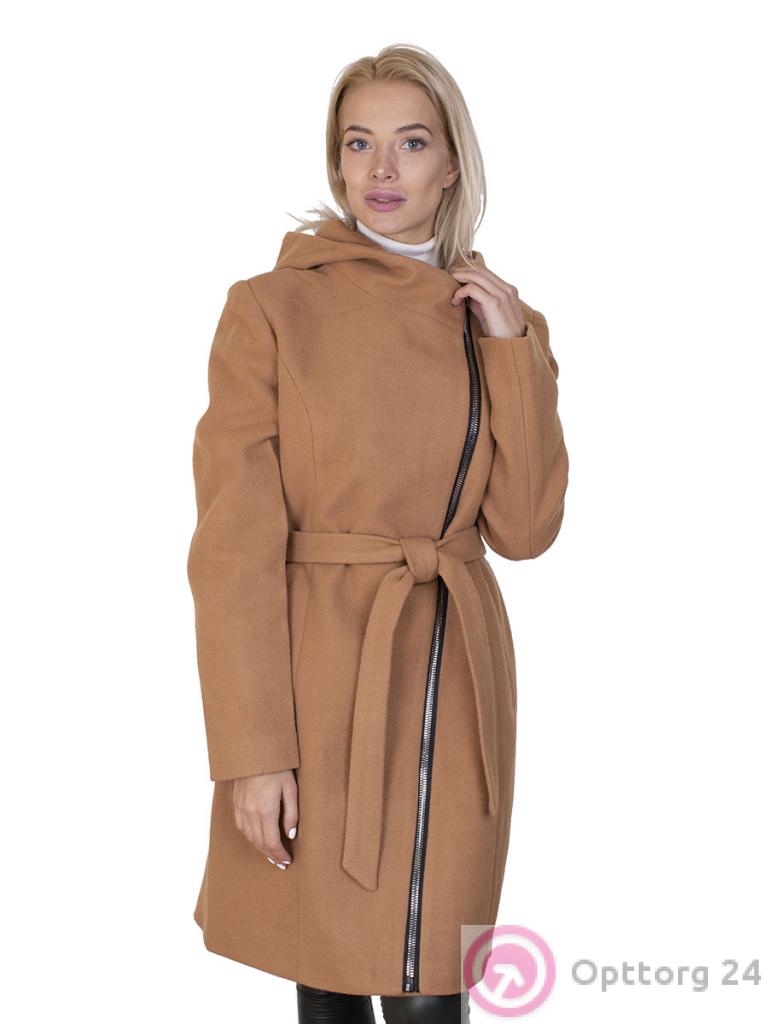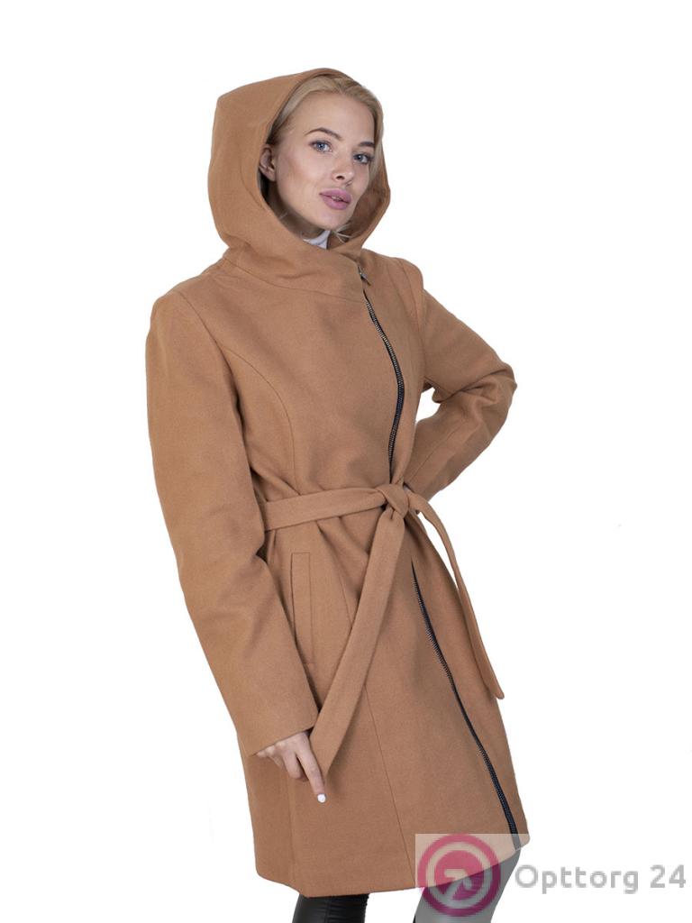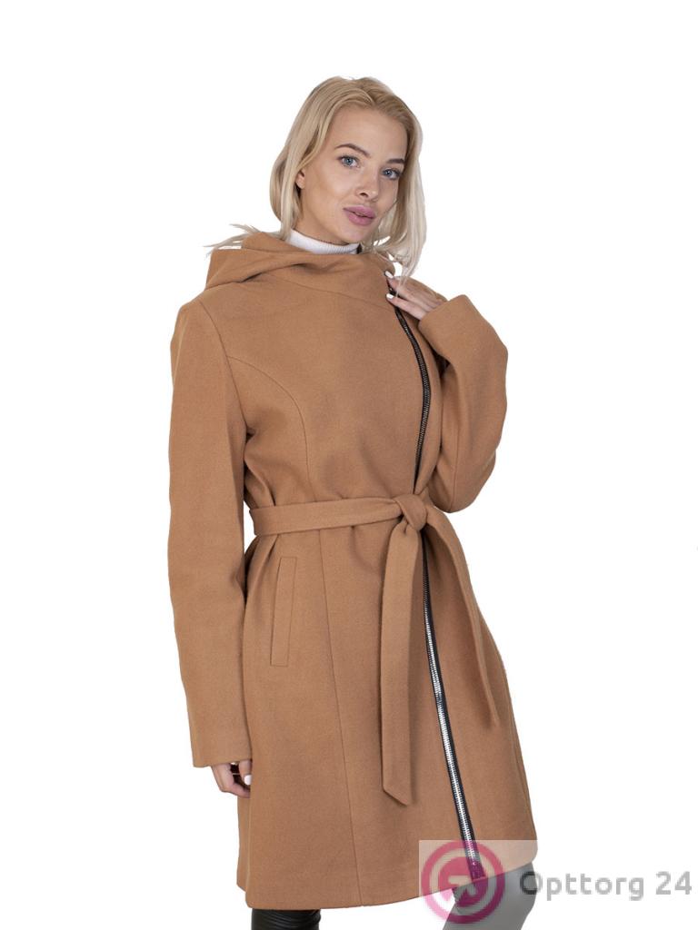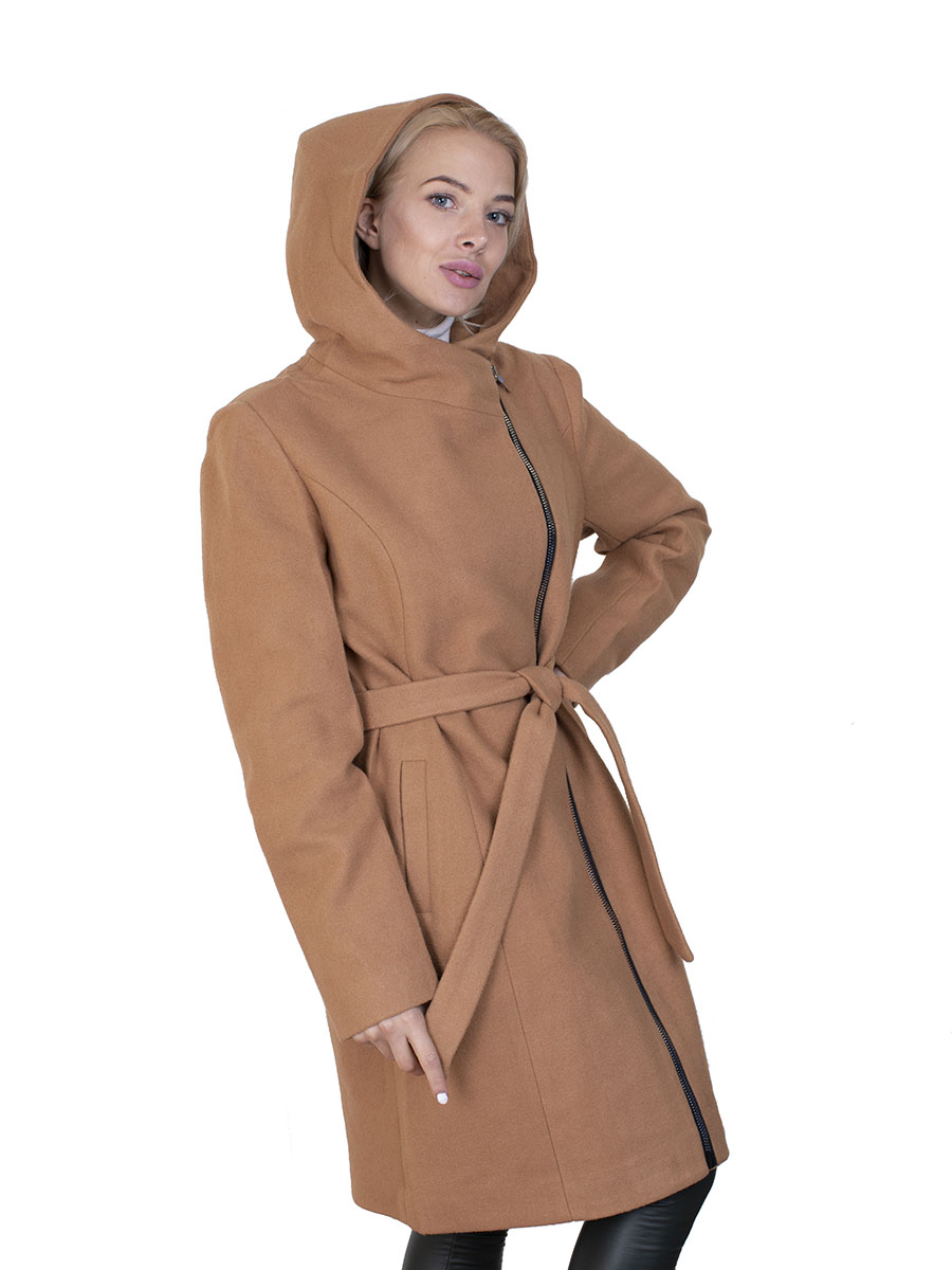 Описание: Пальто женское с косой молнией и поясом. Светло-коричнево цвета, с капюшоном. Застежка на молнии. Есть два кармана.