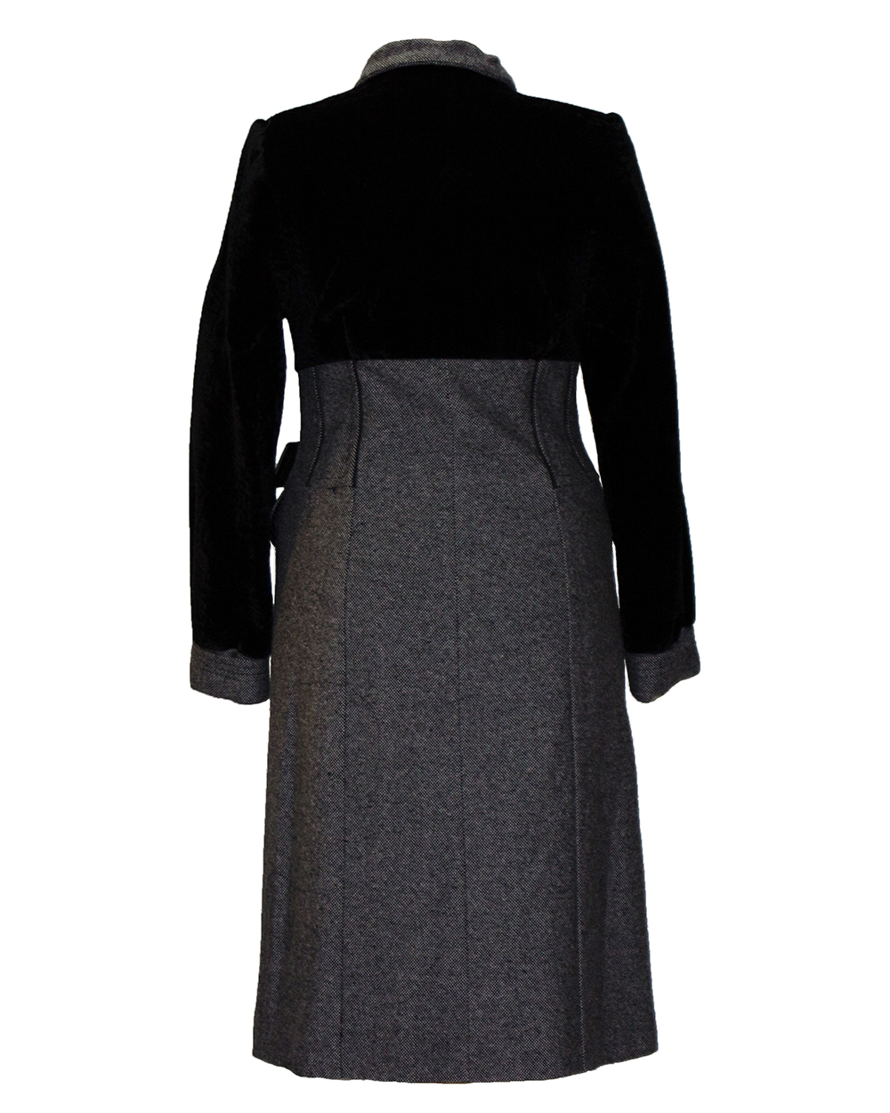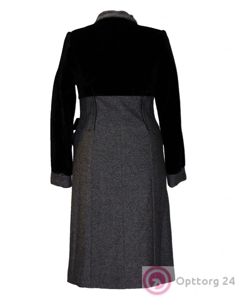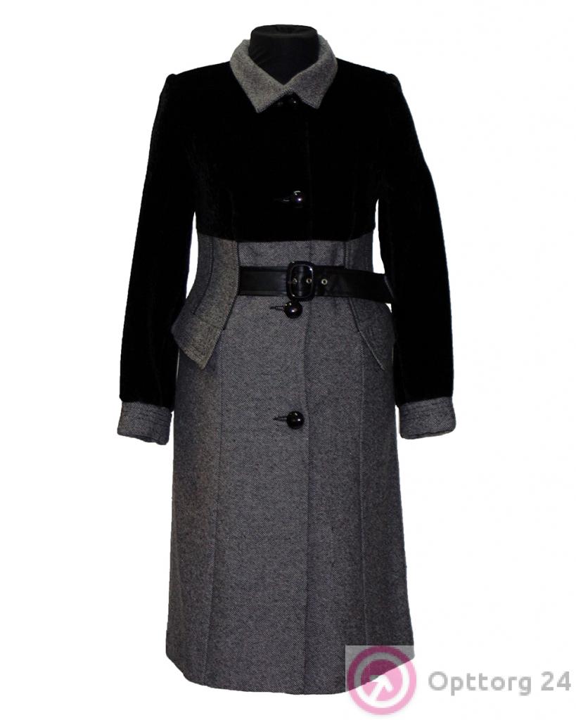 Пальто женское с ремнём под кожу серое с чёрным верхом оптом