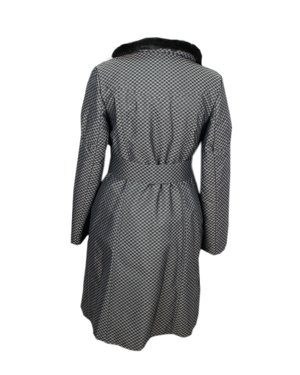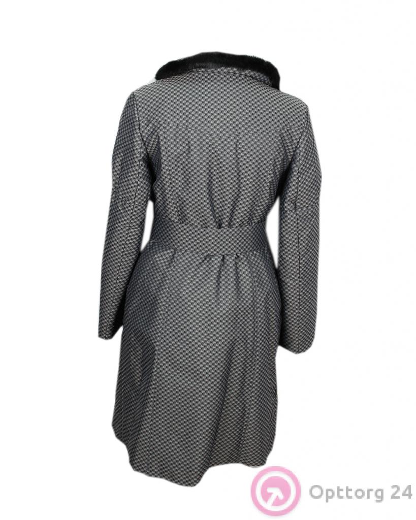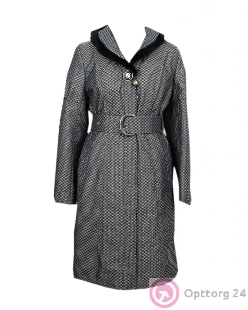 Женское пальто серого цвета с клетчатым принтом. Изделие имеет отложной воротник, пояс в комплекте.