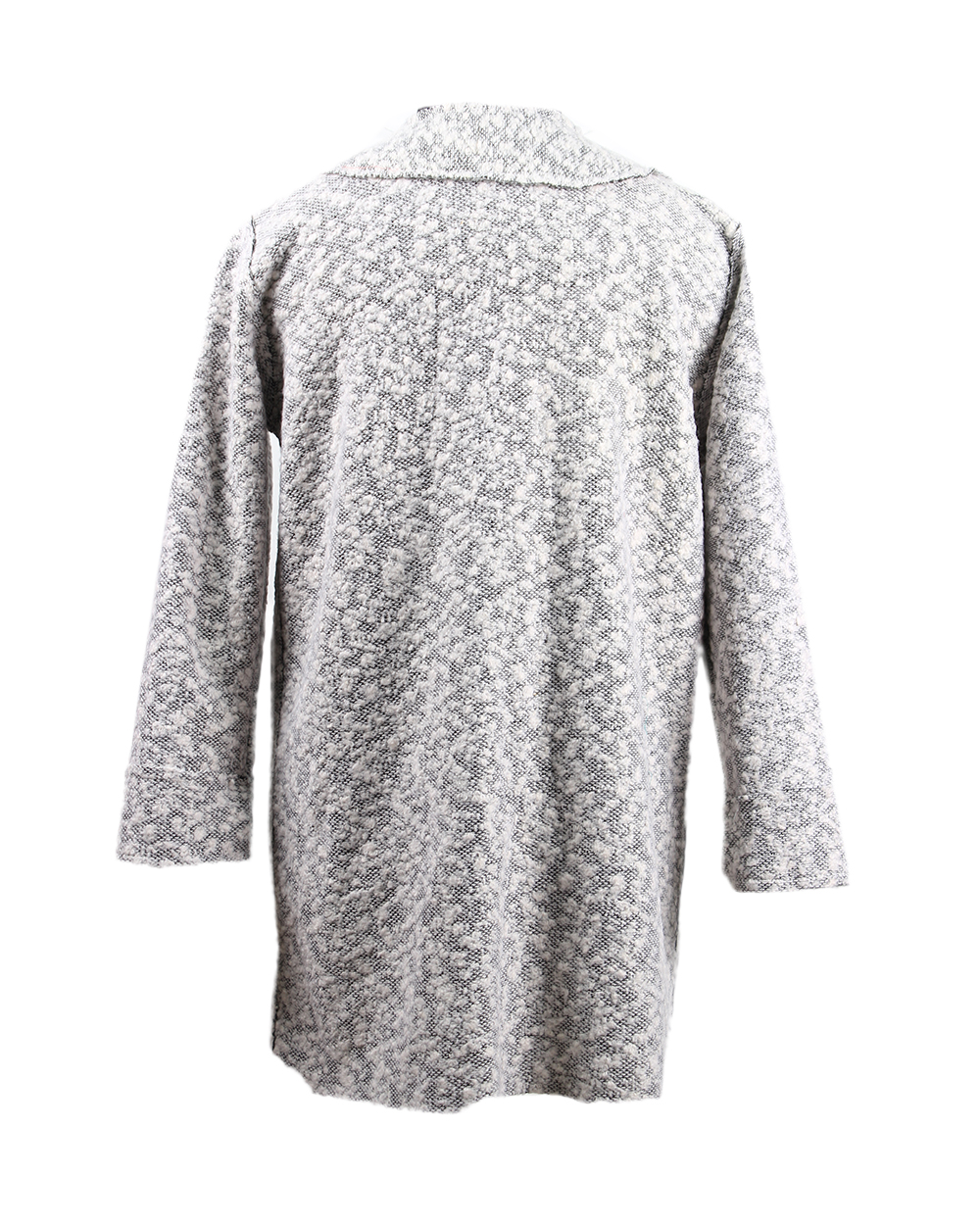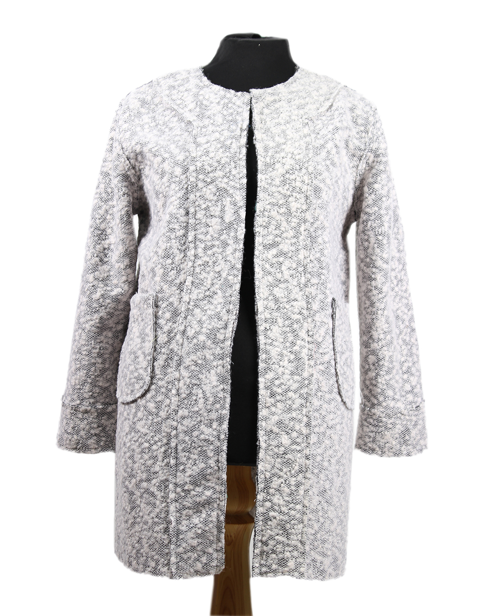 Стильное женское пальто с округлой горловиной. Есть два накладных кармана.