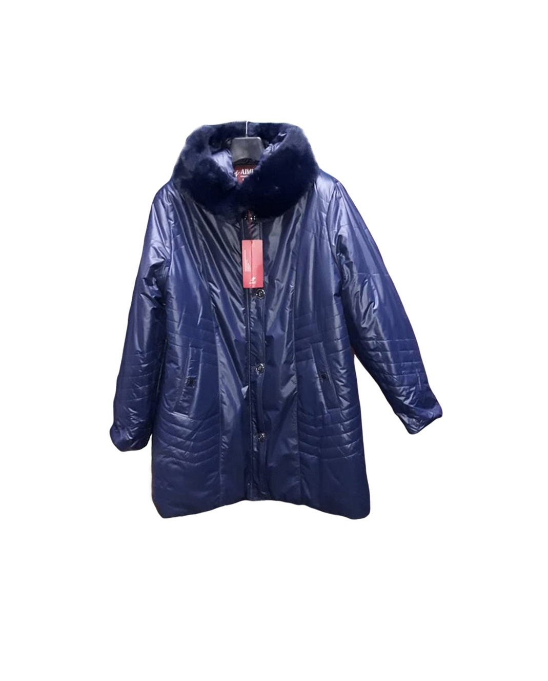 Пальто стеганое женское синего цвета свободного покроя. Модель с карманами и мехом в цвет. Очень стильное и удобное изделие.