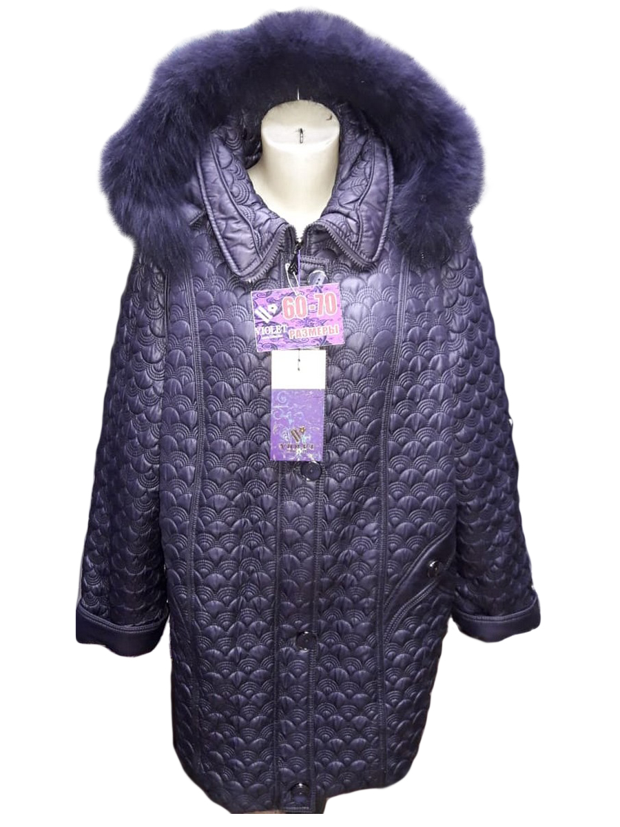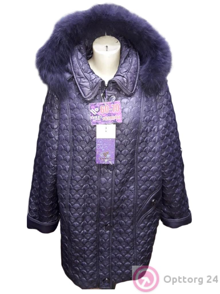 Стеганое зимнее пальто темно-фиолетового цвета для женщин приталенное. Изделие имеет карманы и капюшон с мехом.