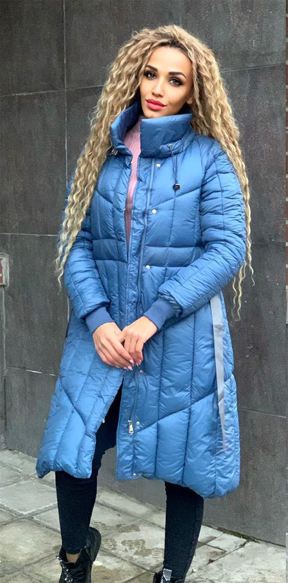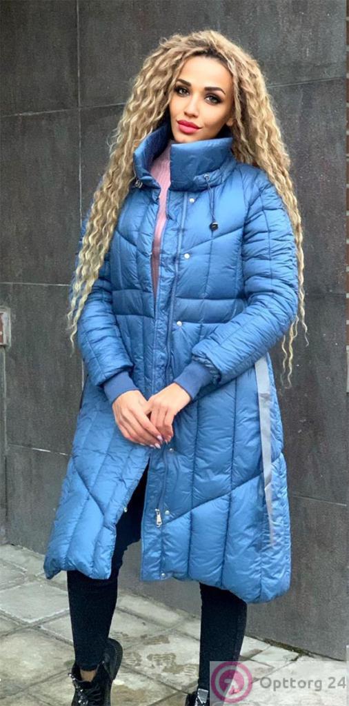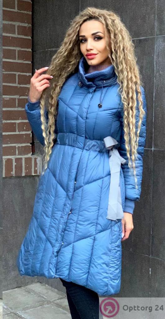Описание: Пальто женское утепленное на синтепоне, синего цвета. Приталенное. Пальто декорировано лентой виде пояса. Застежка на молнии с ветрозащитной планкой на кнопках. Воротник стоечка. Два кармана.