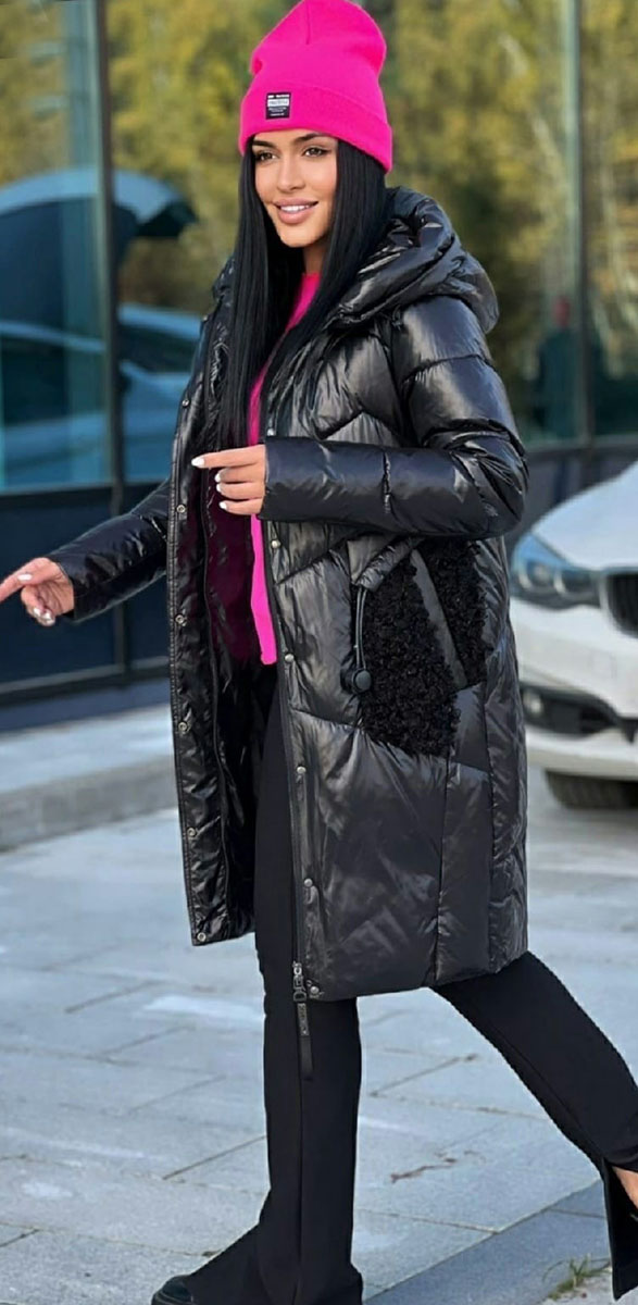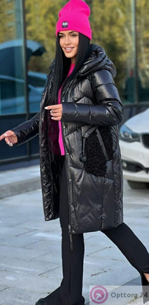 Описание: Пальто зимнее женское черного цвета. Высокий воротник. Есть капюшон. Застежка на молнии с ветрозащитной планкой на кнопках, есть карманы.