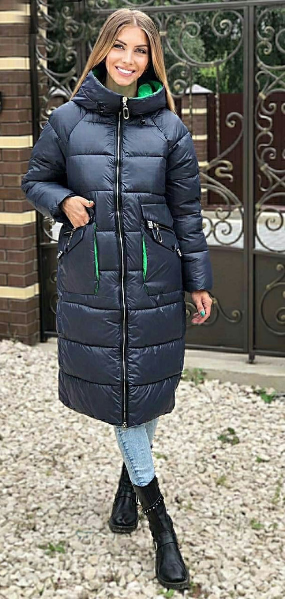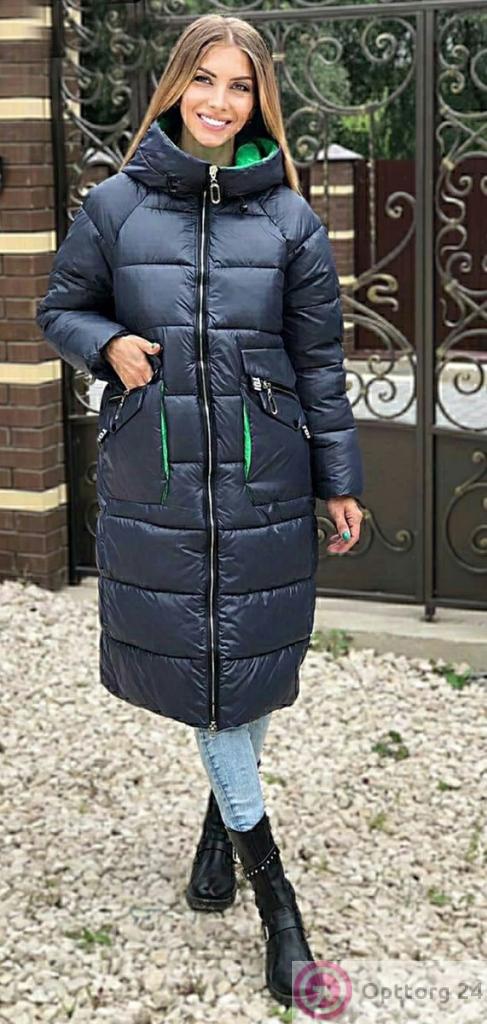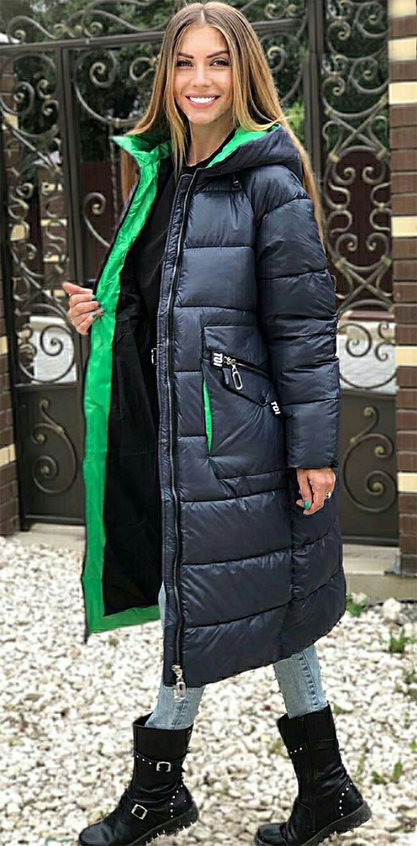 Описание: Пальто зимнее женское цвет черный с ярко-зелеными акцентами. Высокий воротник. Есть капюшон. Застежка на двухсторонней молнии, есть два больших накладных кармана на молнии.