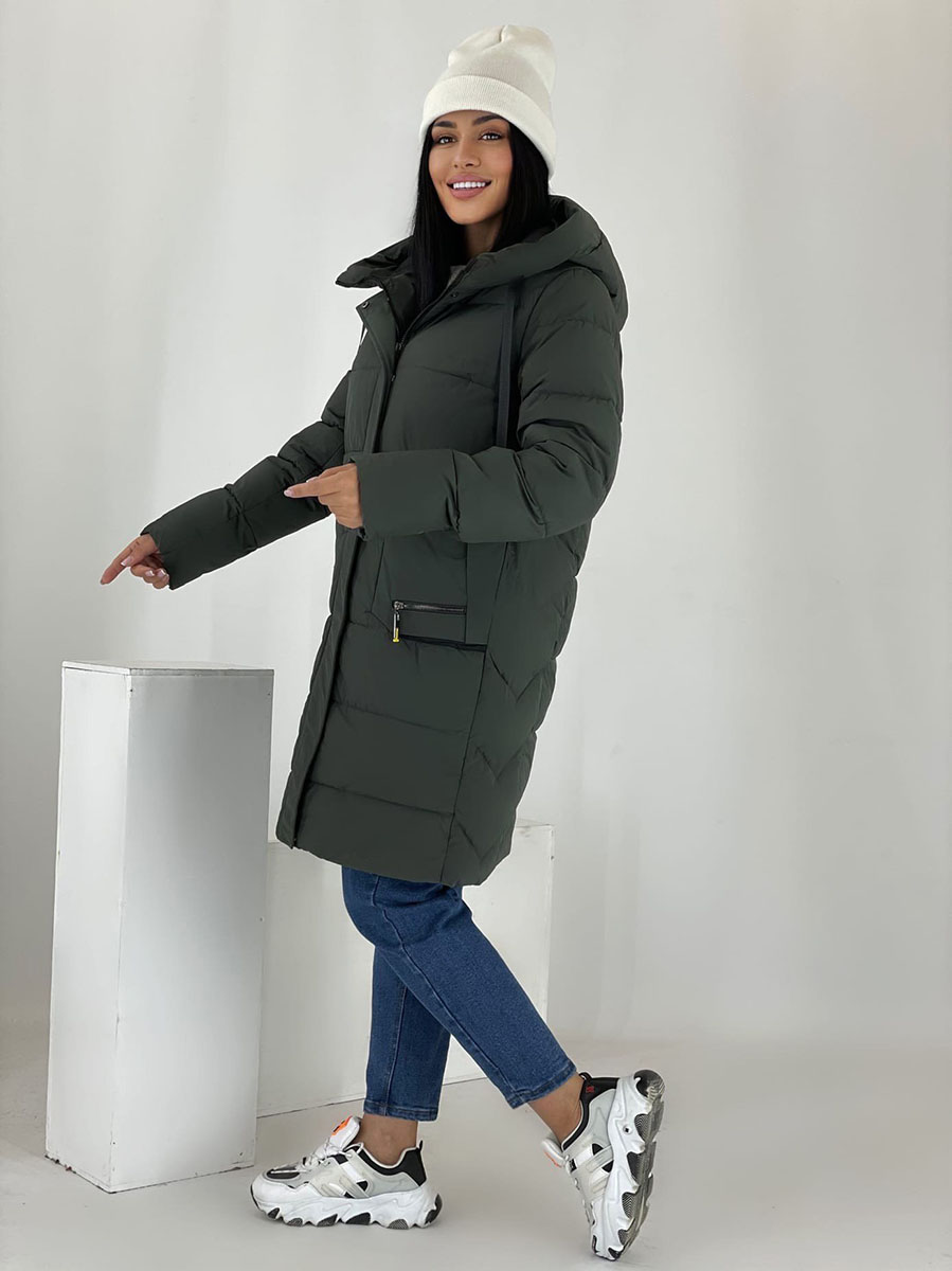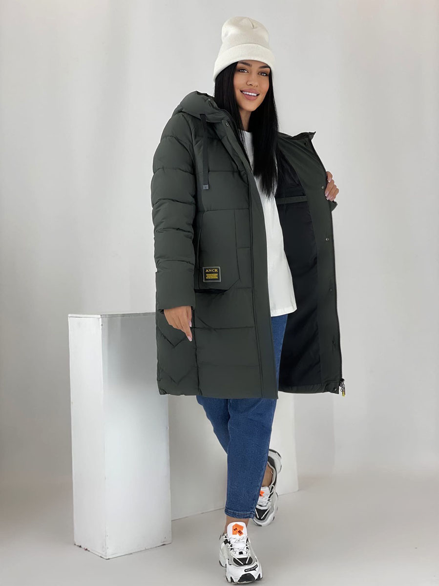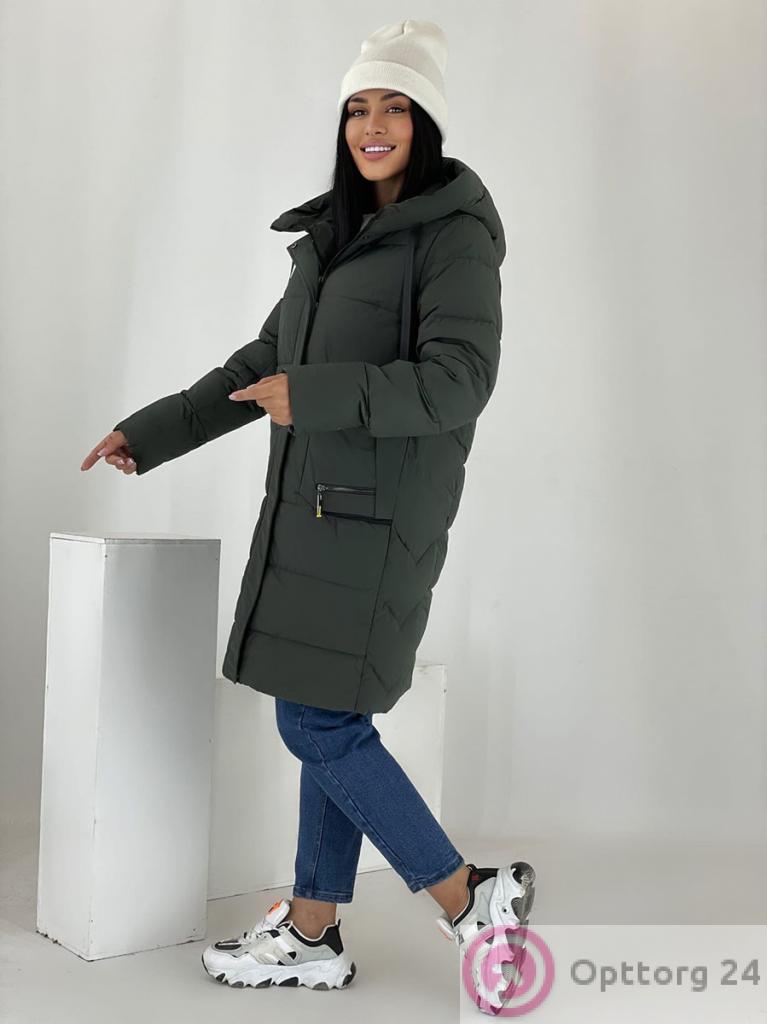Описание: Пальто зимнее женское цвет хаки. Высокий воротник. Есть капюшон декорирован шнурком. Застежка на молнии с ветрозащитной планкой на кнопках, есть два кармана.