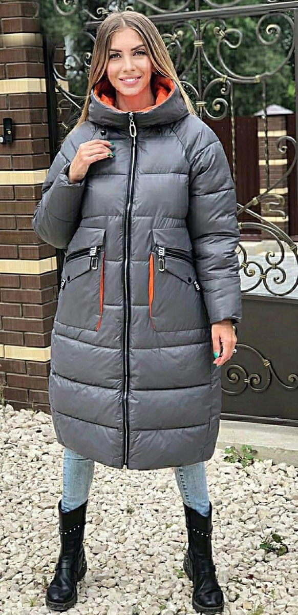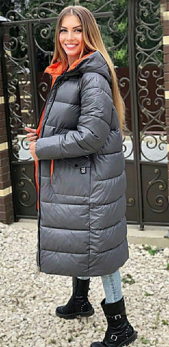 Описание: Пальто зимнее женское цвет мокрый асфальт. Высокий воротник. Есть капюшон. Застежка на двухсторонней молнии, есть два больших накладных кармана на молнии.