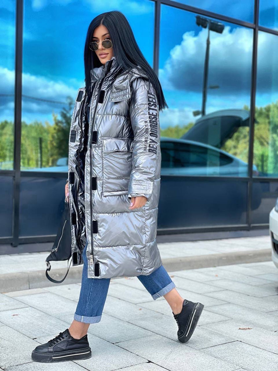 Описание: Пальто зимнее женское молодежного стиля, серебряного цвета. Застежка на молнии с ветрозащитной планкой на кнопках. Есть два больших накладных кармана и капюшон.