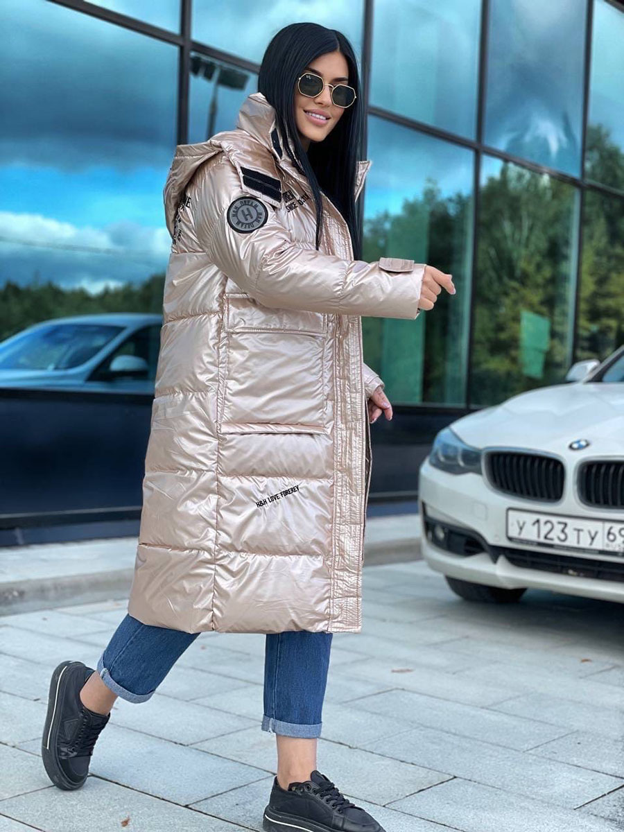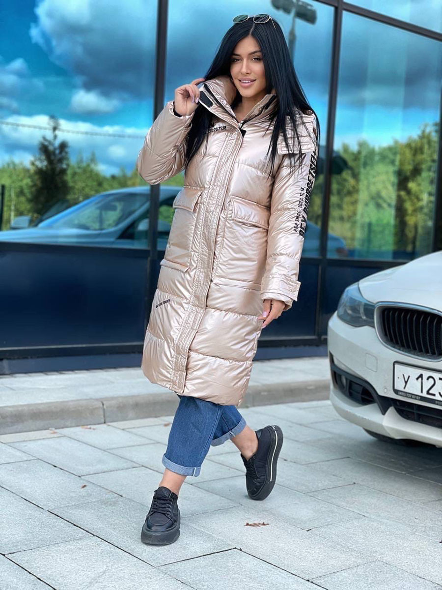 Описание: Пальто зимнее женское молодежного стиля, кремового цвета. Застежка на молнии с ветрозащитной планкой на кнопках. Есть два больших накладных кармана и капюшон.