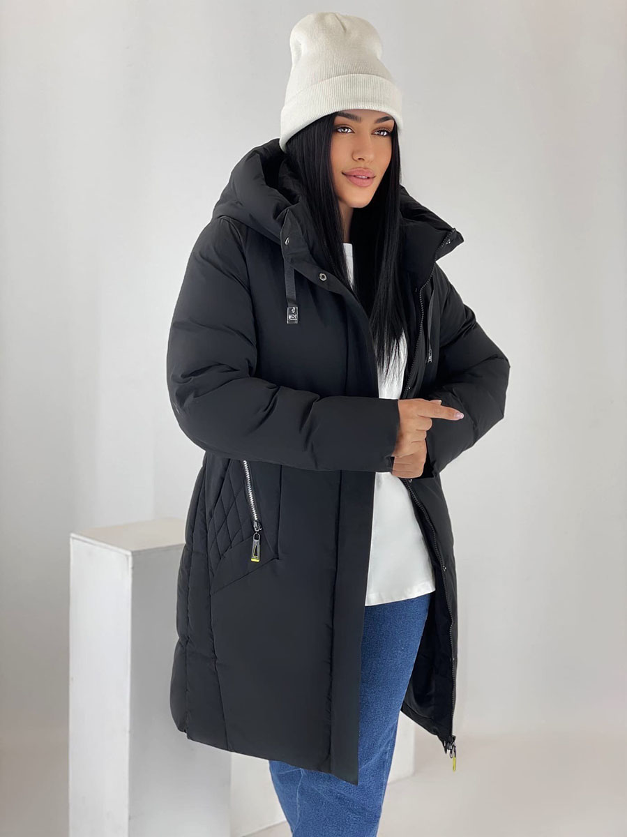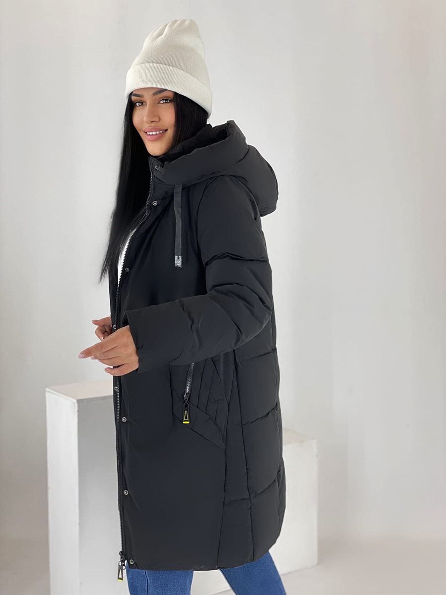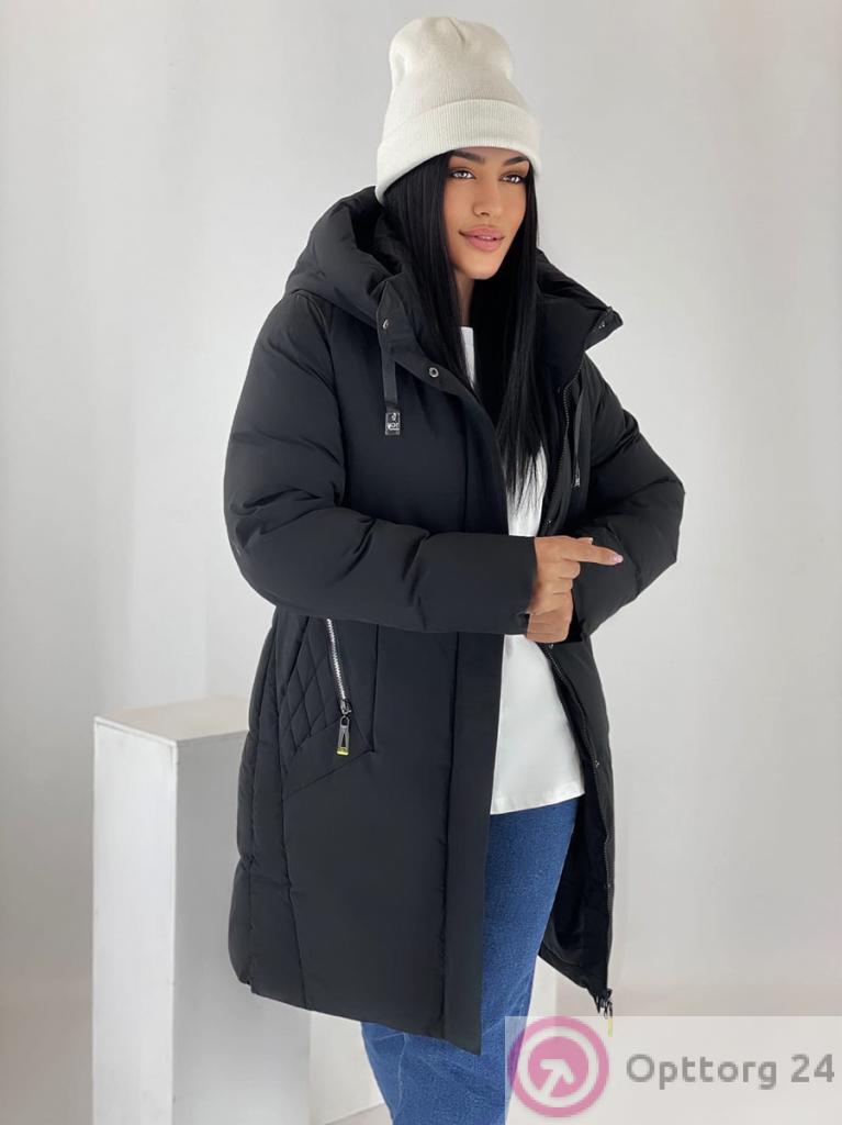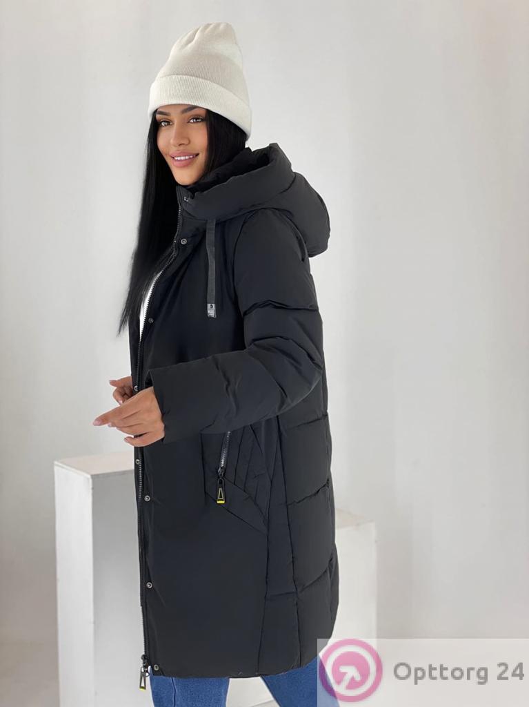 Описание: Пальто зимнее женское черного цвета. Высокий воротник. Есть капюшон. Застежка на молнии с ветрозащитной планкой на кнопках, есть два кармана на молнии.