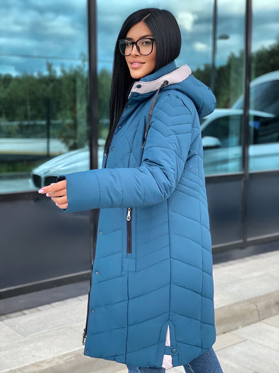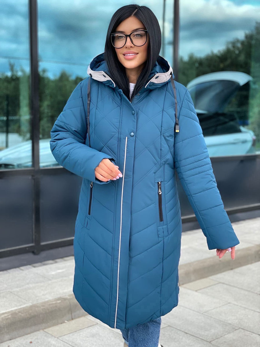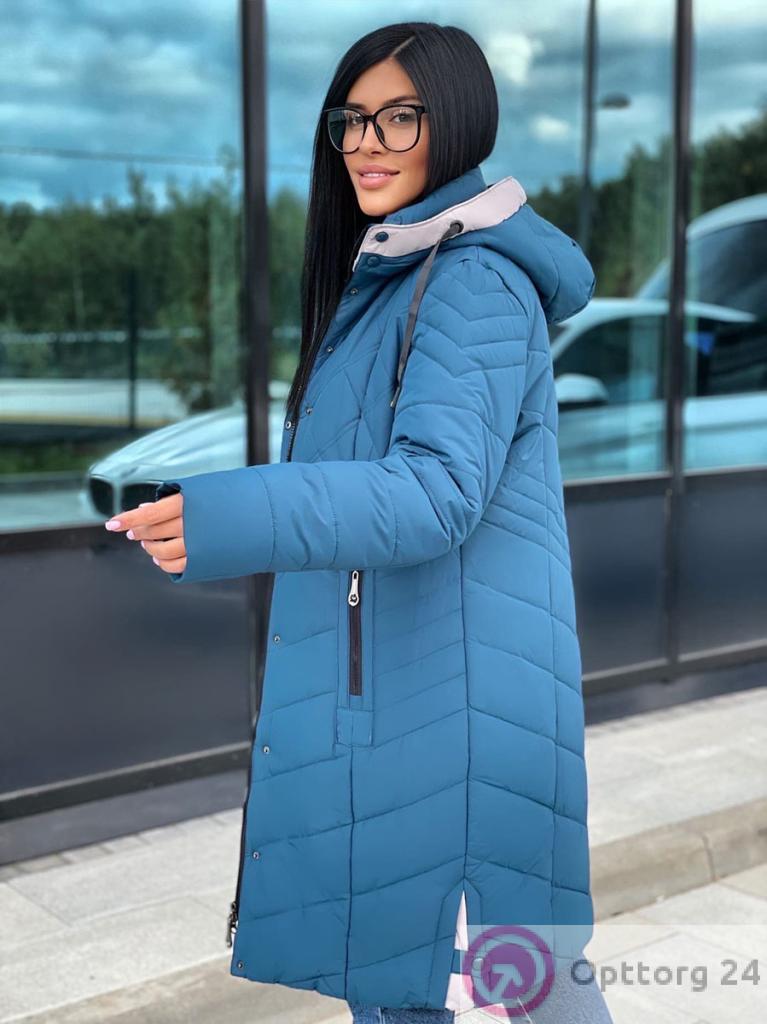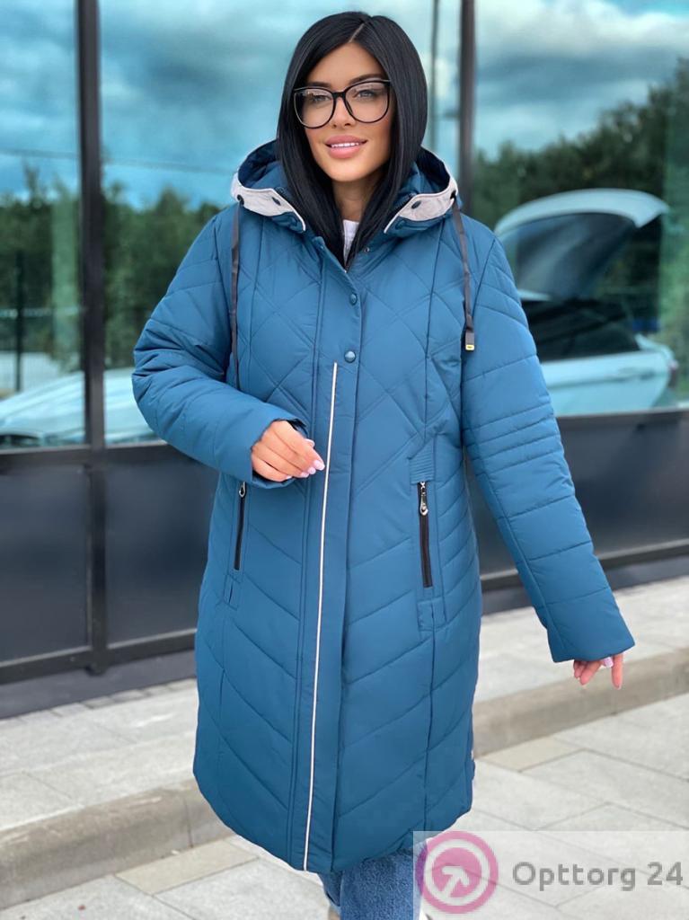 Описание: Пальто зимнее женское цвет синий. Застежка на молнии с ветрозащитной планкой на кнопках. Есть два кармана на молнии. Капюшон декорирован шнурком.