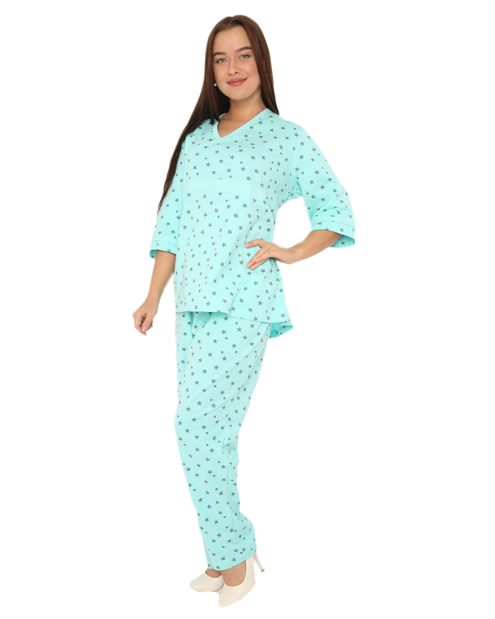 Легкая женская пижама бирюзовго цвета с принтом в виде мелких звездочек. V-образная горловина в кофте.