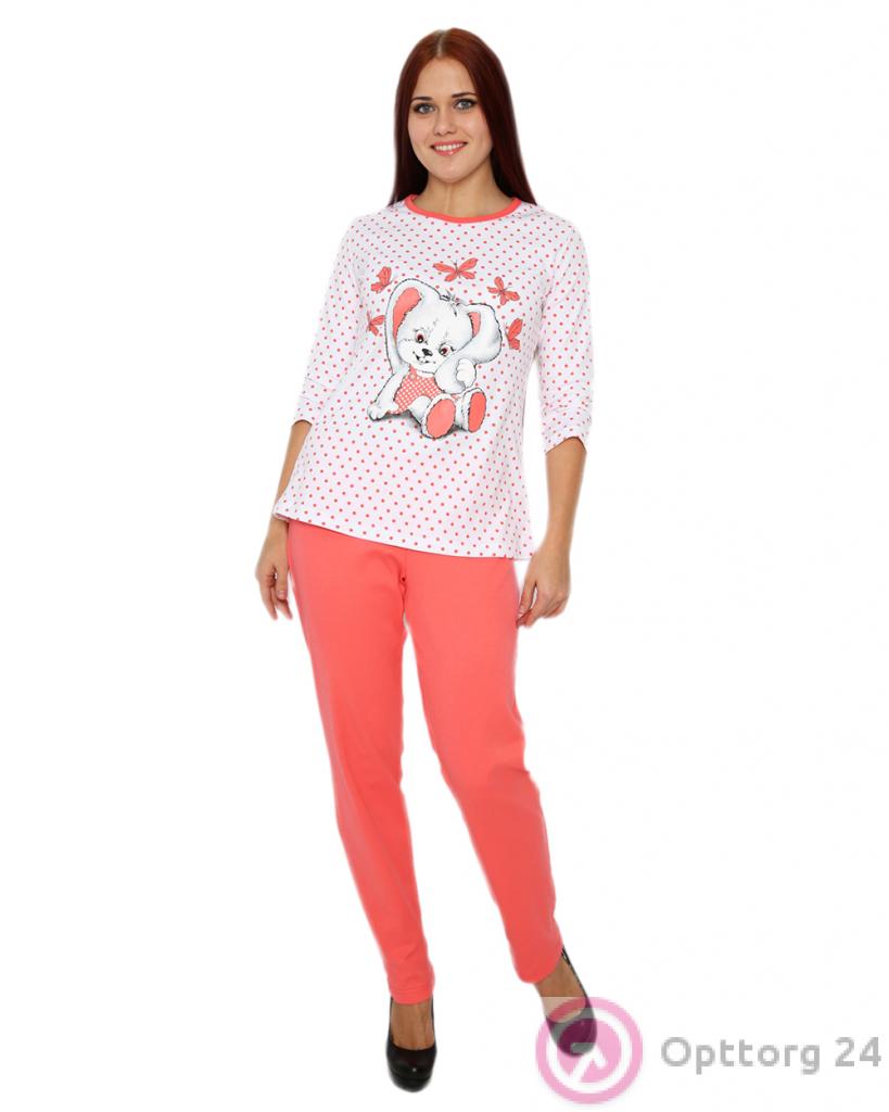 Женская пижама с заужеными книзу брюками и кофтой с длинными рукавами. Кофта украшена принтом в горошек и рисунком в виде зайчика.