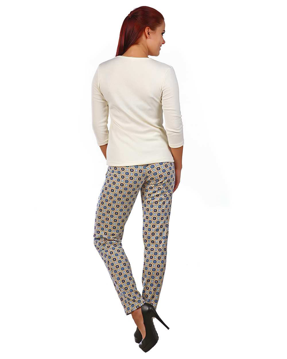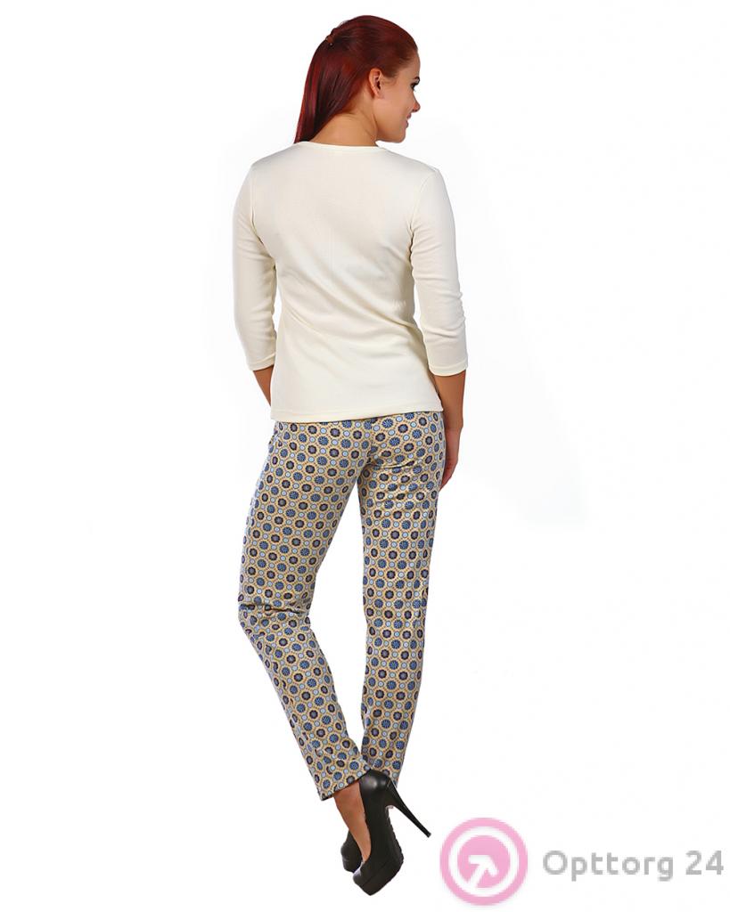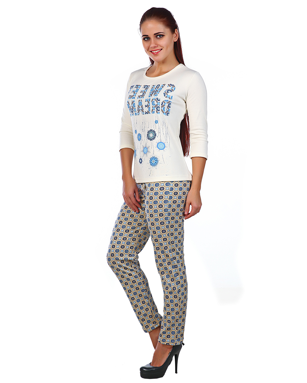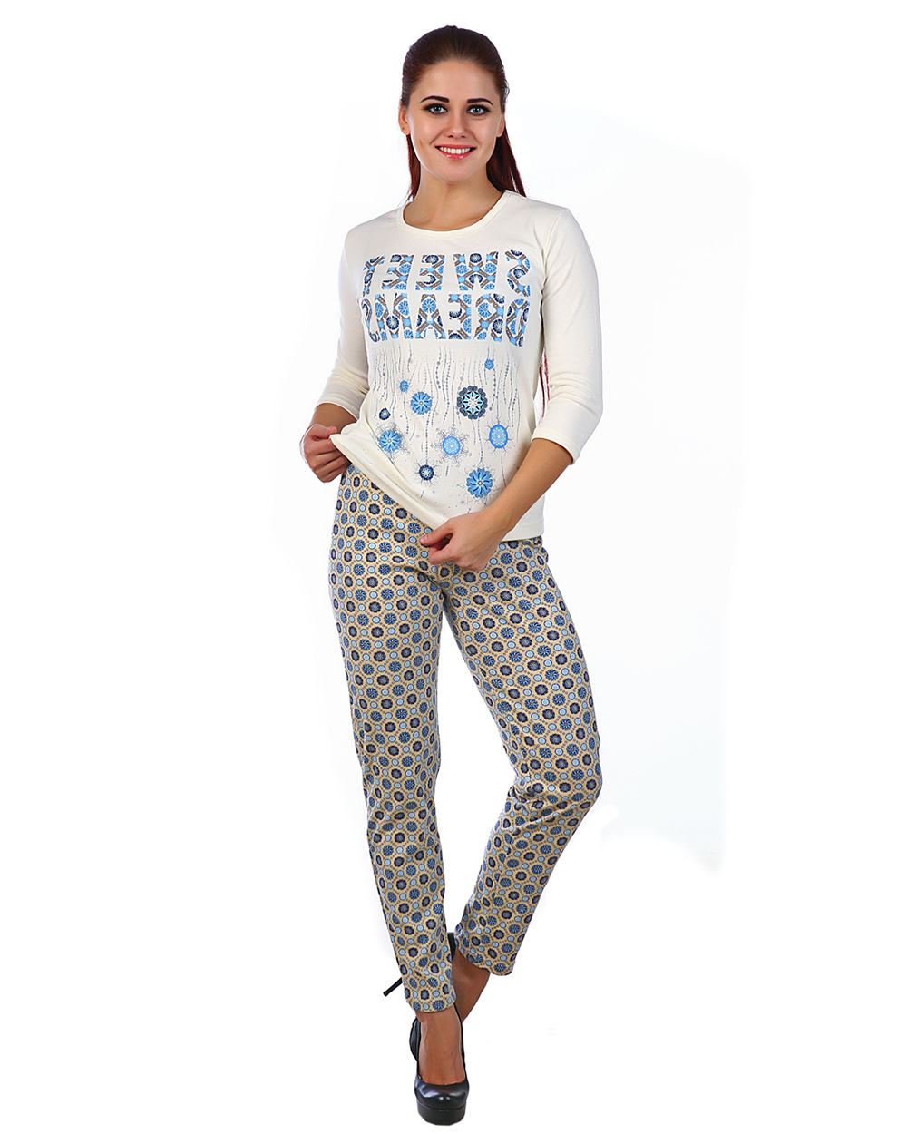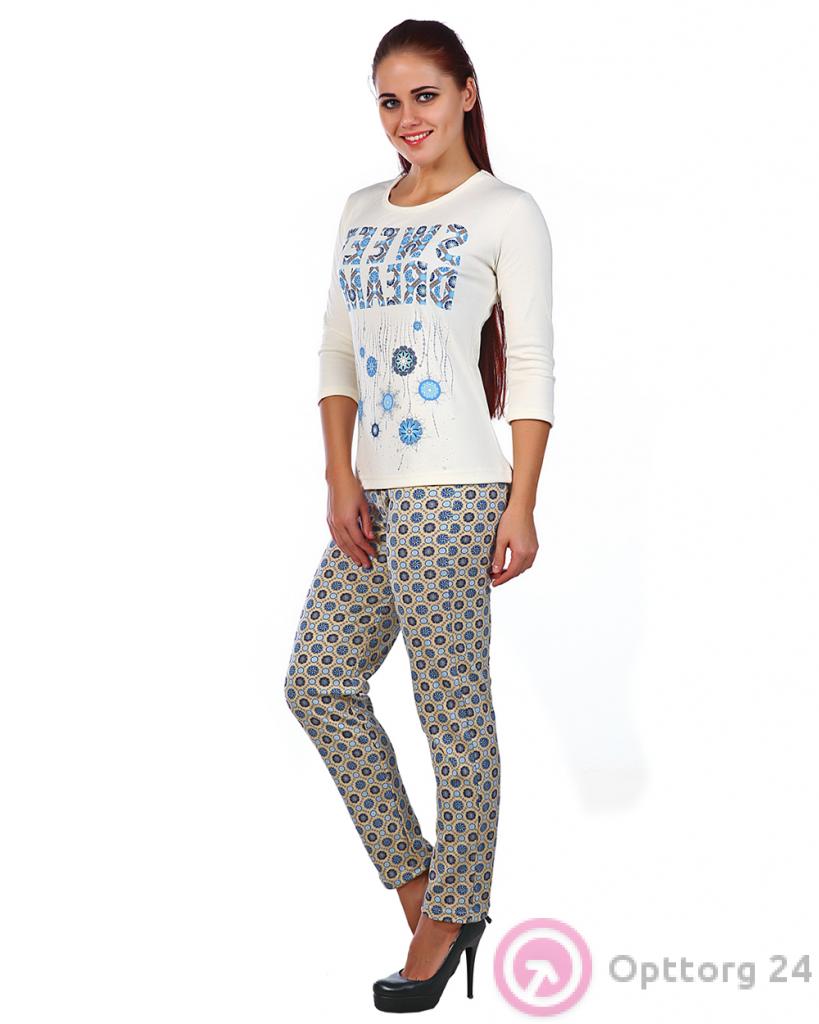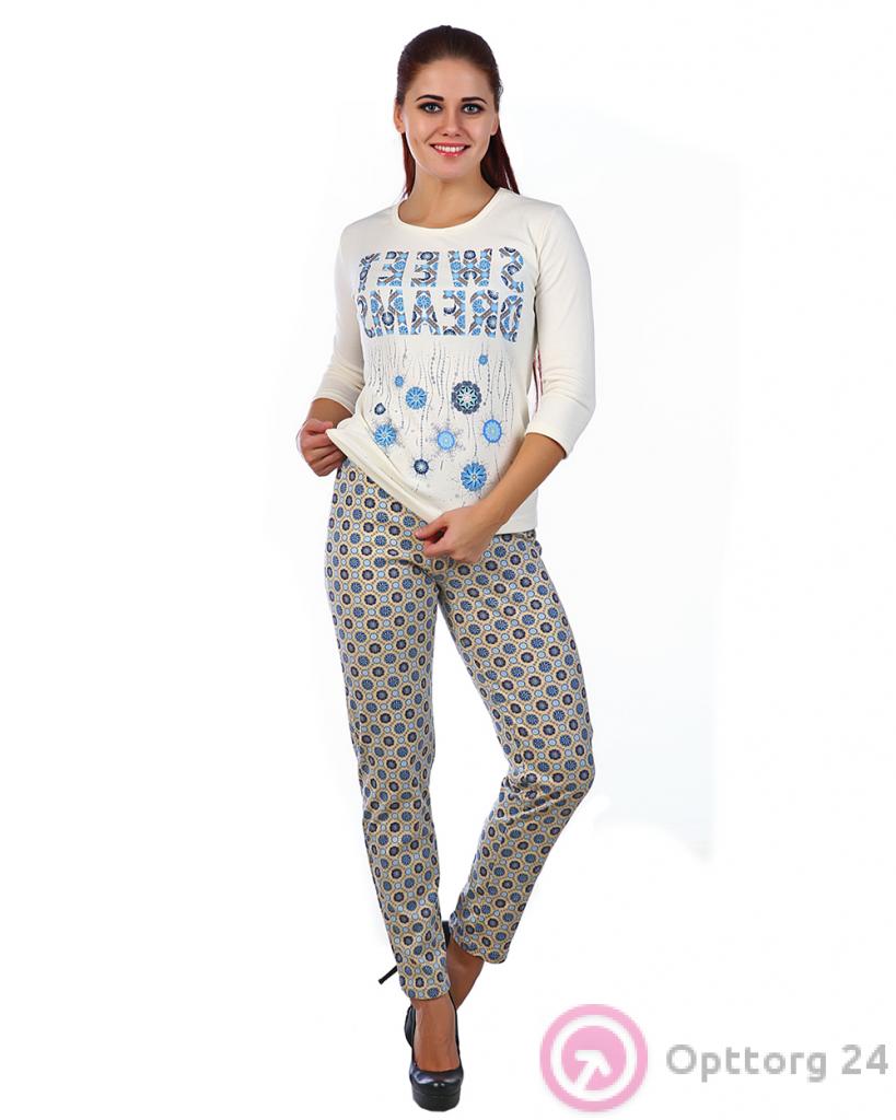 Женская пижама белого цвета с голубым принтом и надписью. В наборе кофта с длинными рукавами и зауженные книзу брюки.