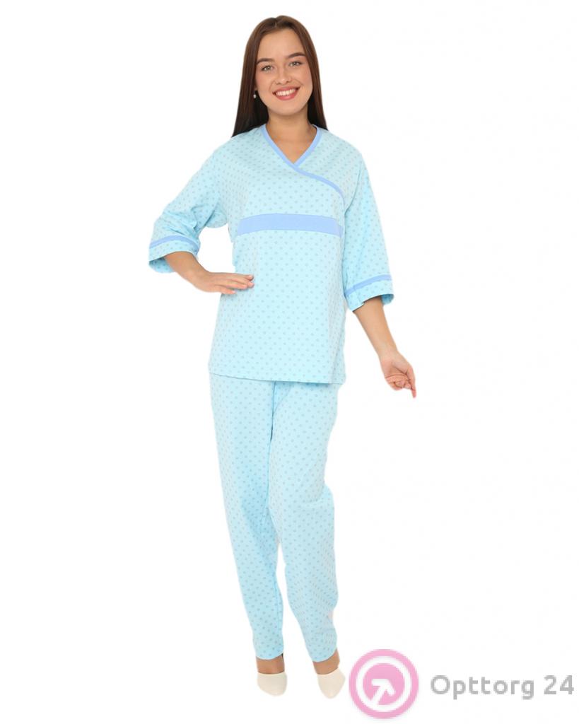 Приятная к телу женская пижама светло бирюзового цвета с принтом. Модель имеет футболку с длинными рукавами и V-образным вырезом горловины.