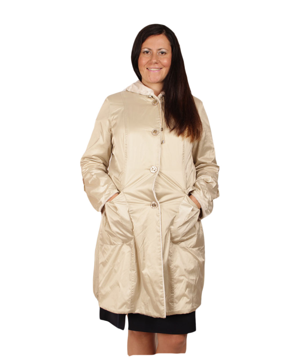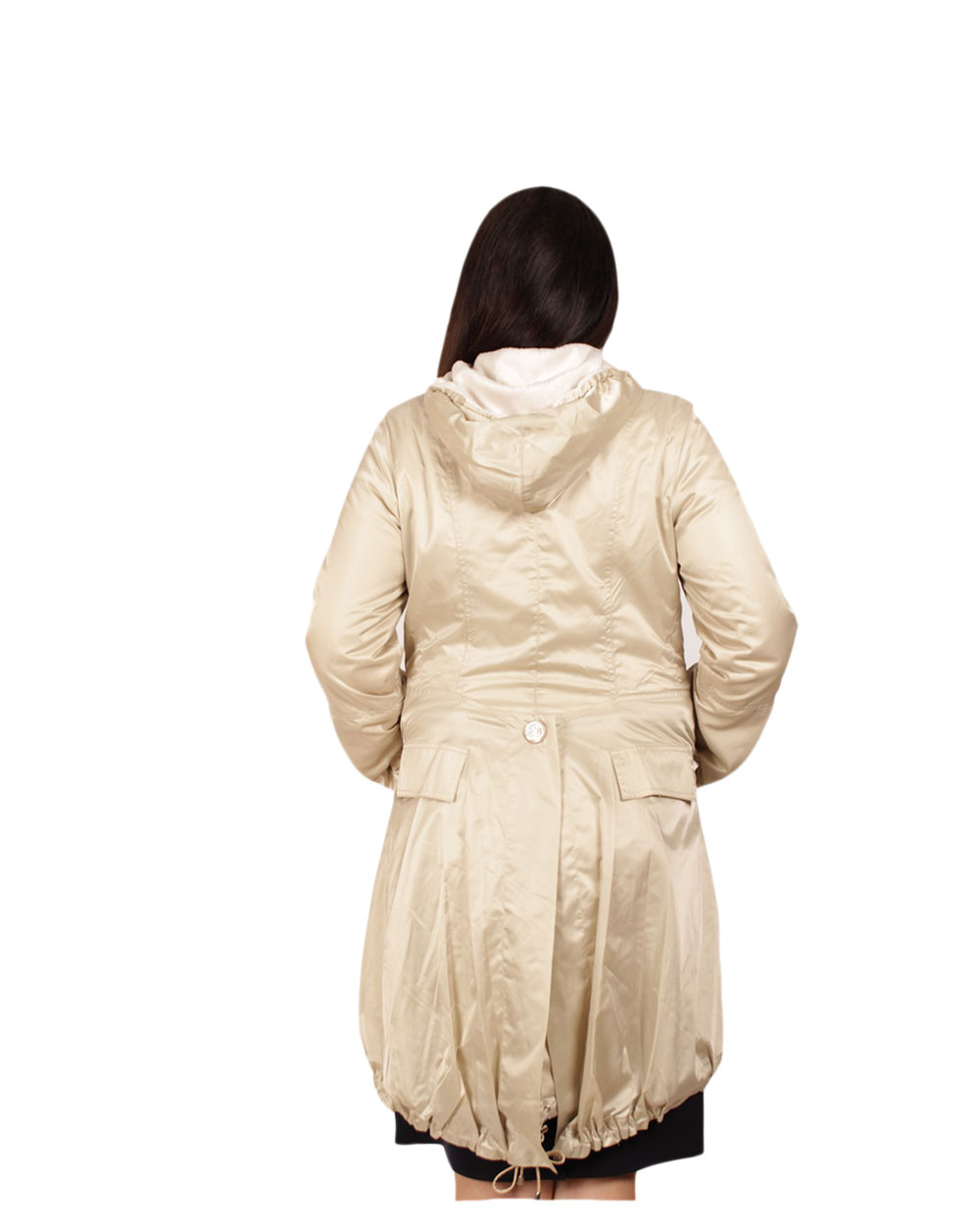 Аккуратный женский плащик длиной по колено. Мягкий бежевый цвет, удобный крой и высококачественная ткань не оставят равнодушными ни одну модницу.