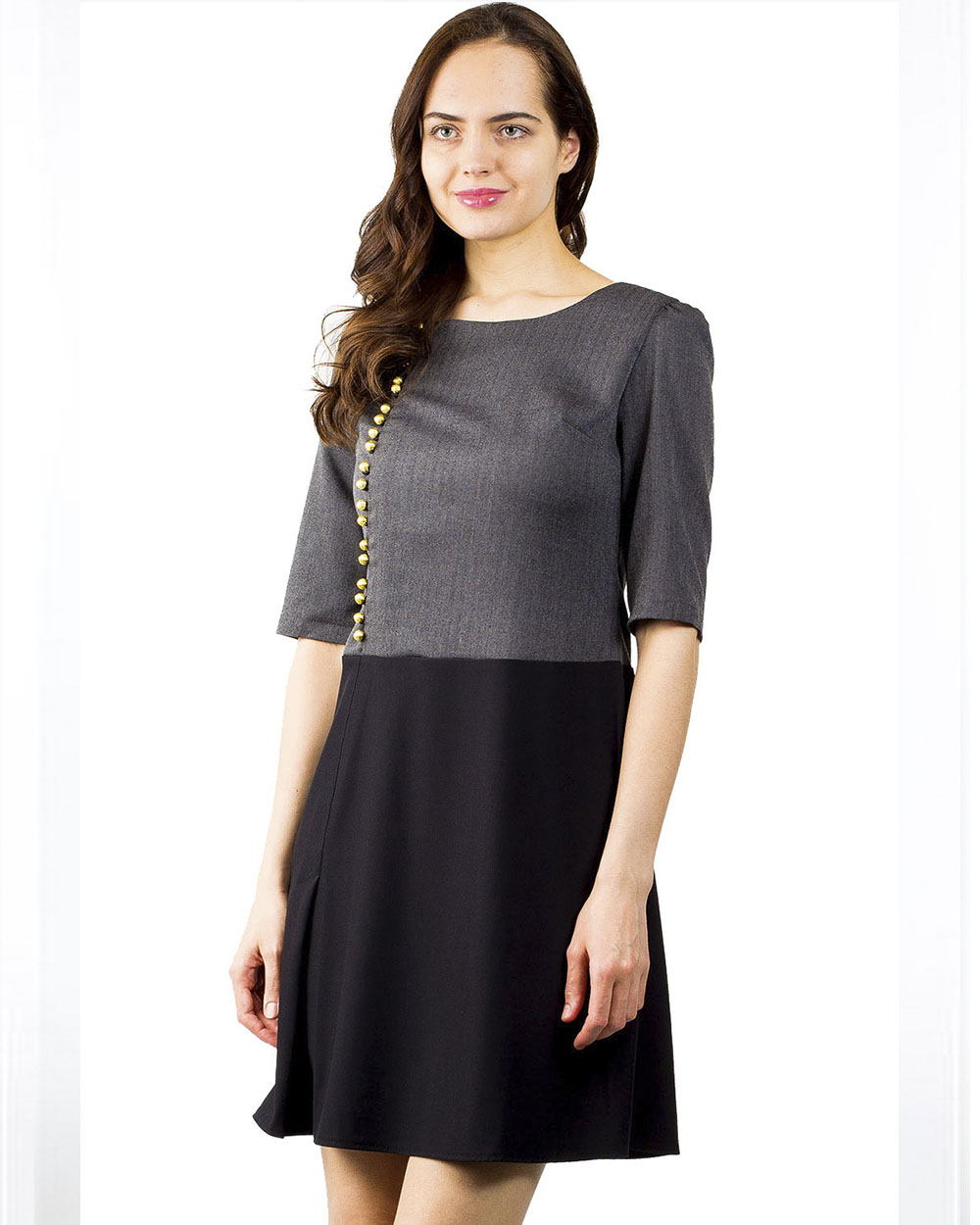 Платье черно серого цвета, Асимметричная застёжка выполнена из пуговиц золотистого цвета. добавляет особый интерес к данной модели.