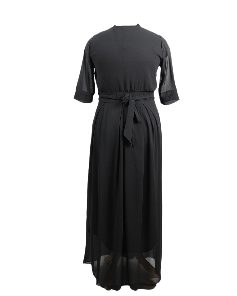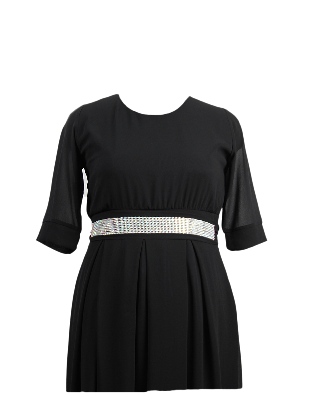Элегантное женское платье черного цвета. Пояс украшен стразами.