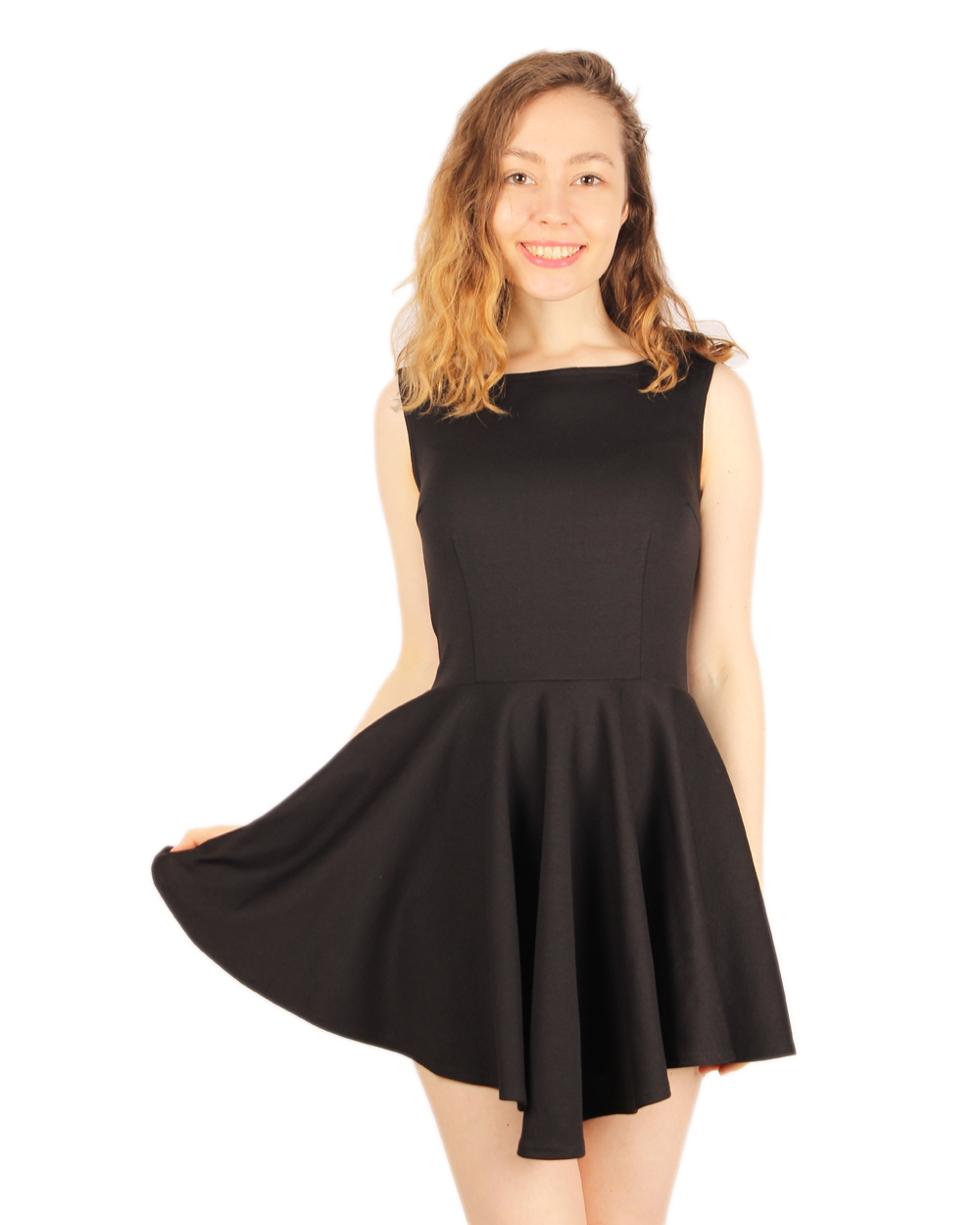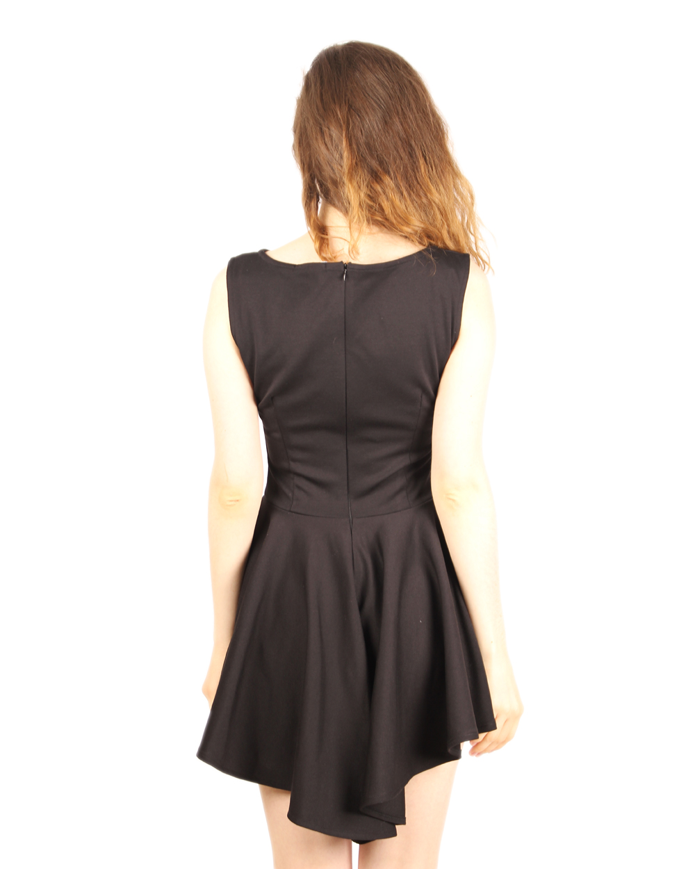 Красивое короткое платье без рукавов с расклешенным асимметричным низом. Модель классического черного цвета с приталенным верхом. Низ ромбовидный, расклешенный. Вырез "лодочка". Яркая и элегантная модель для романтичного свидания или вечеринки.