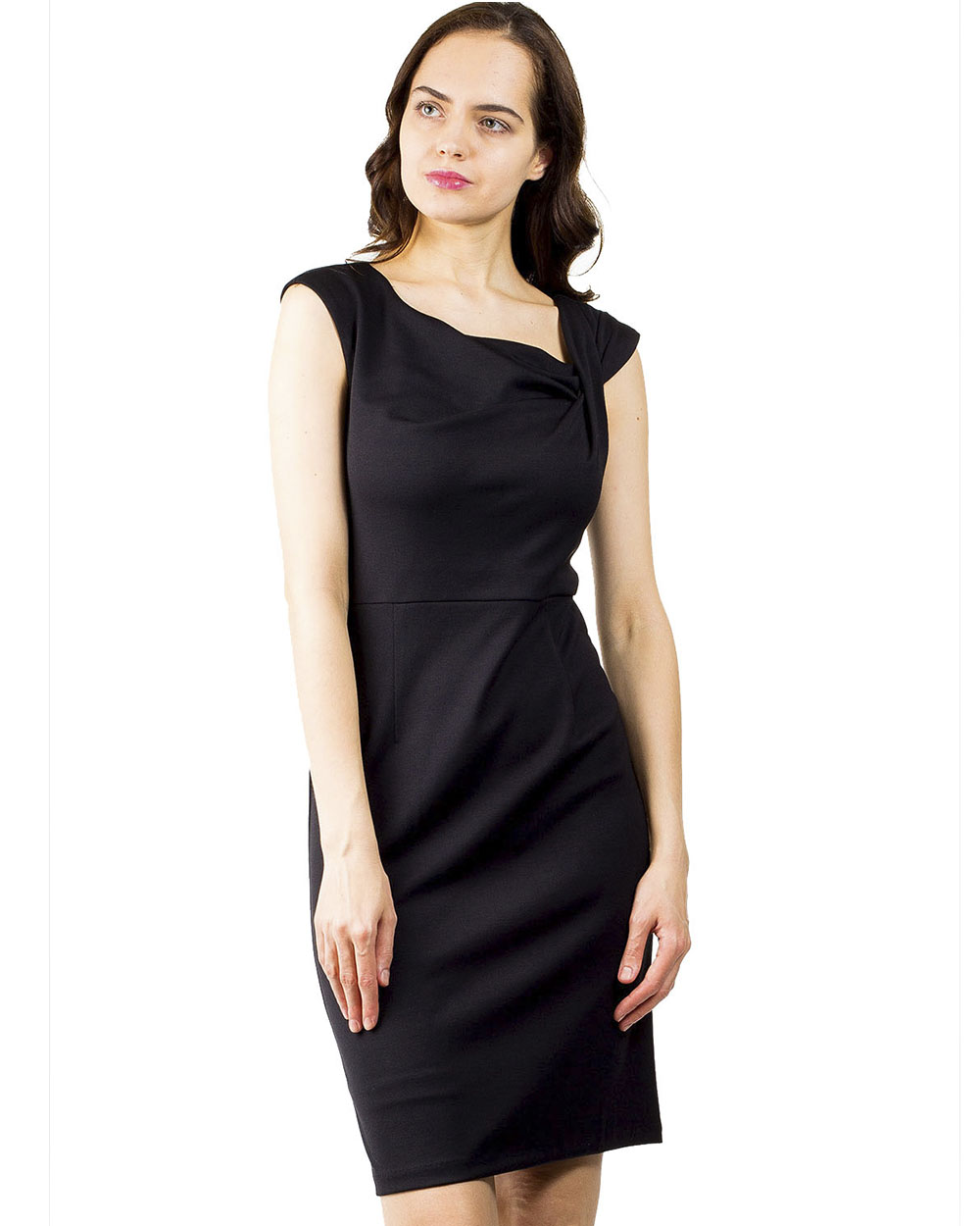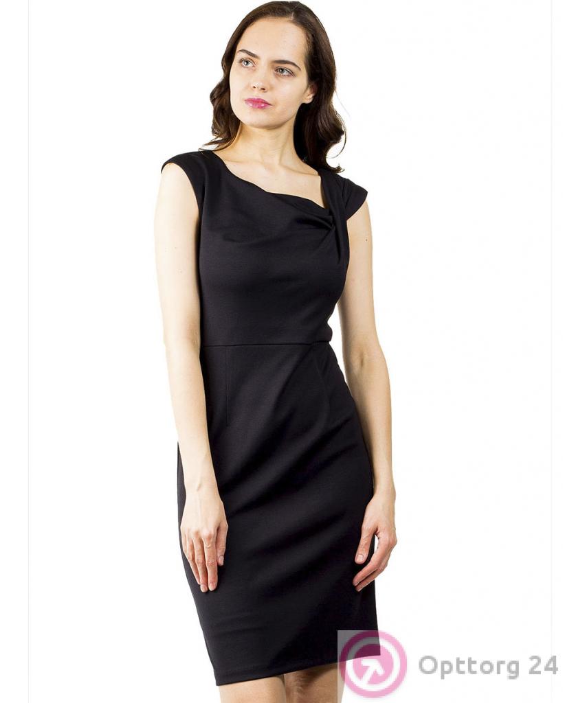 Платье прямого кроя с асимметричным украшением в области груди. Мадель черного цвета, выполнено из материала приятного к телу. Прекрасно смотрится с туфлями на высоком каблуке.